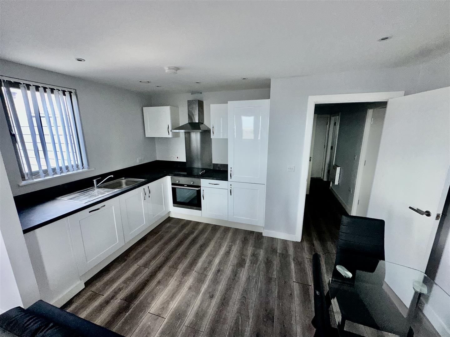 Lounge/ Kitchen - Double glazed window, electric wall heaters, wooden flooring, kitchen comprises of a range of fitted base and wall units, integrated Electric Oven and Hob, Fridge Freezer, dishwasher
