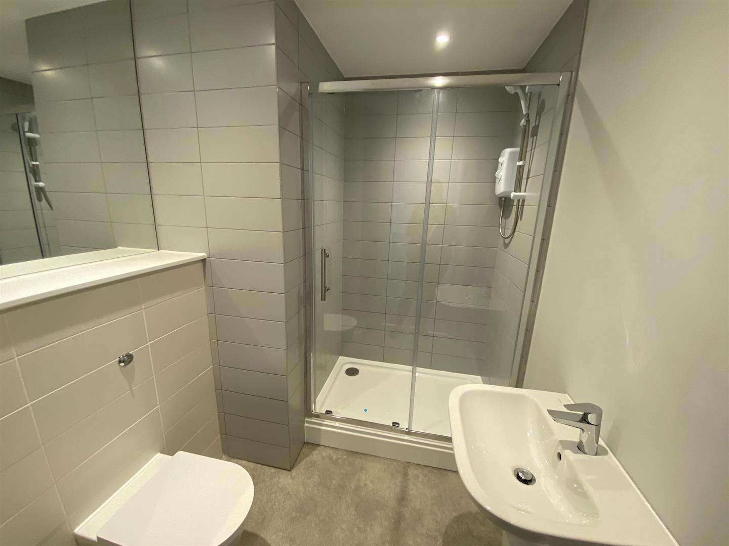 Shower Room - Part tiled, large shower base, glass enclosure, sink, low level w.c. heated towel rail, double glazed window