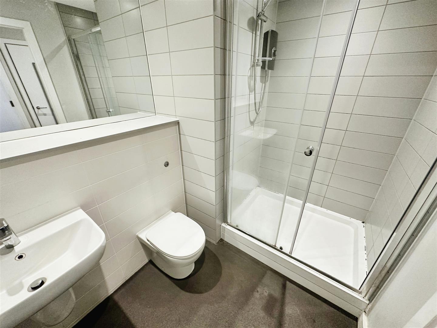 Bathroom - Fully tiled, walk in electric shower, low level w.c. sink unit.