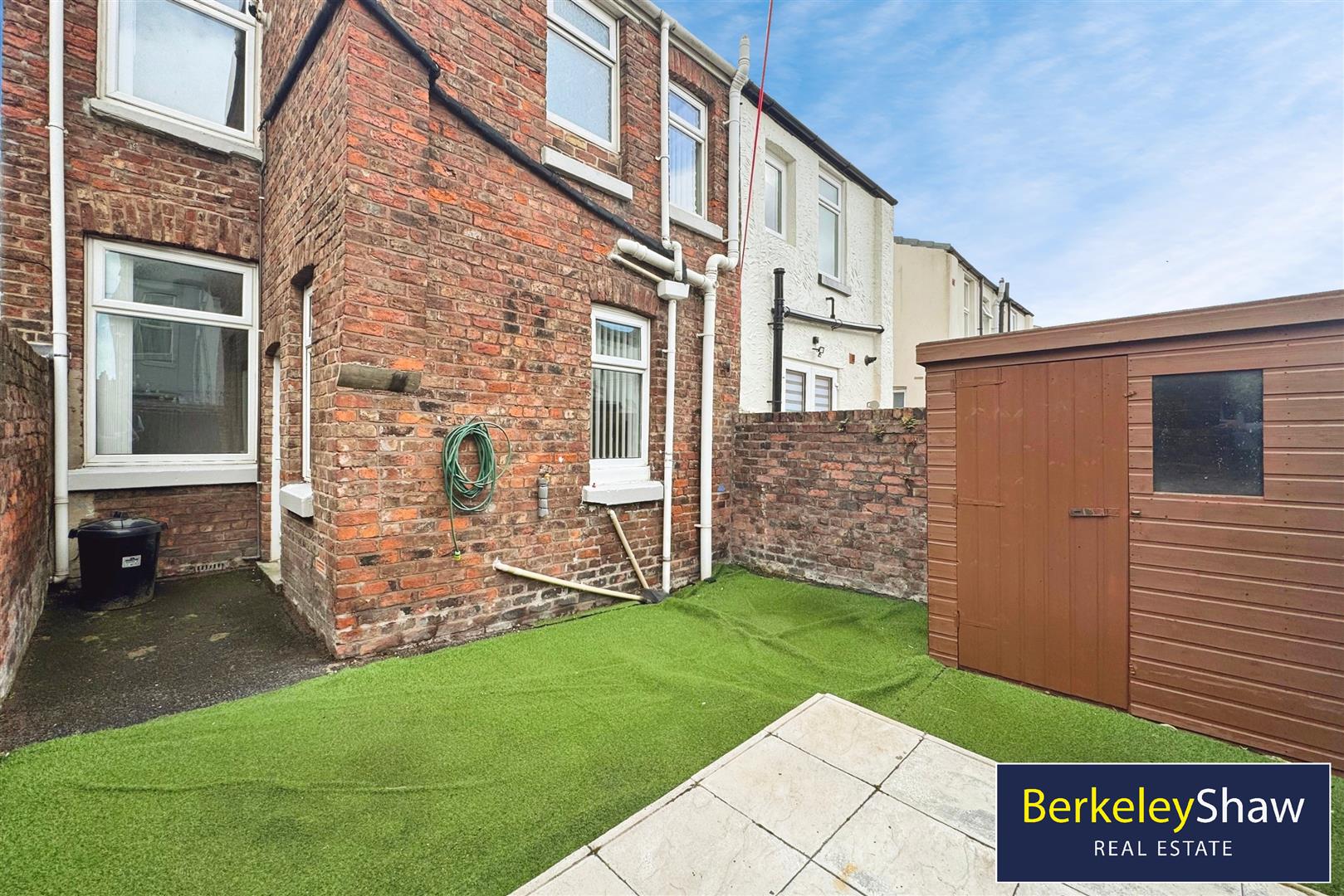 Rear Exterior - Walled yard, rear gate, exterior tap, shed