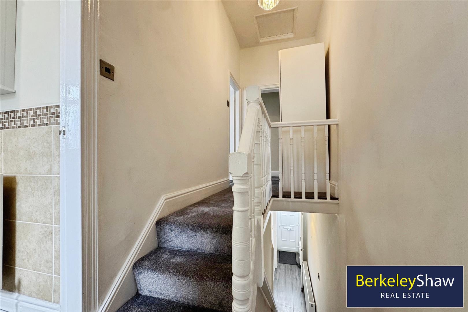 Hallway - Inner door, carpet on staircase, laminate flooring, radiator