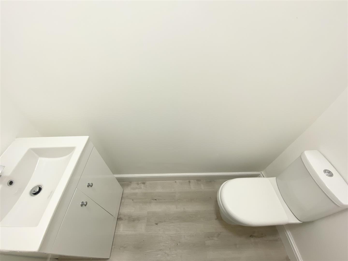 Esuite Shower Room - panelled walls , laminate flooring, shower ccubical with shower over, vaity sink unit., low level w.c.