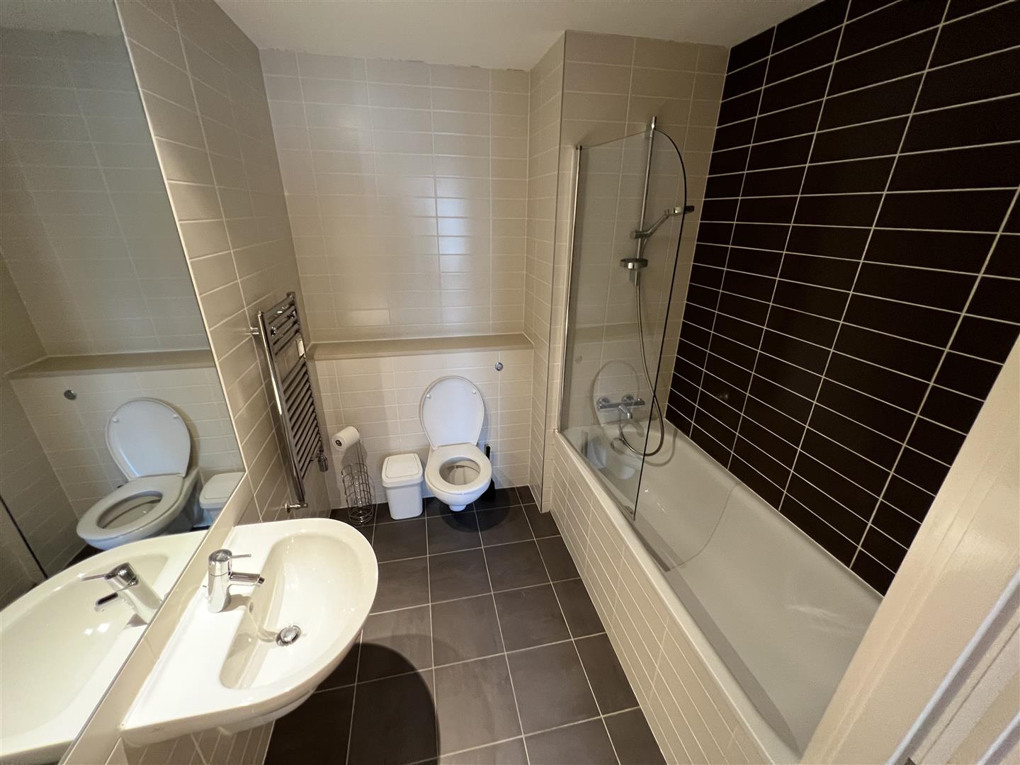 Bathroom - Fully tiled walls and flooring panelled bath with shower over, wc. and sink, ladder heated towel rail and large mirror