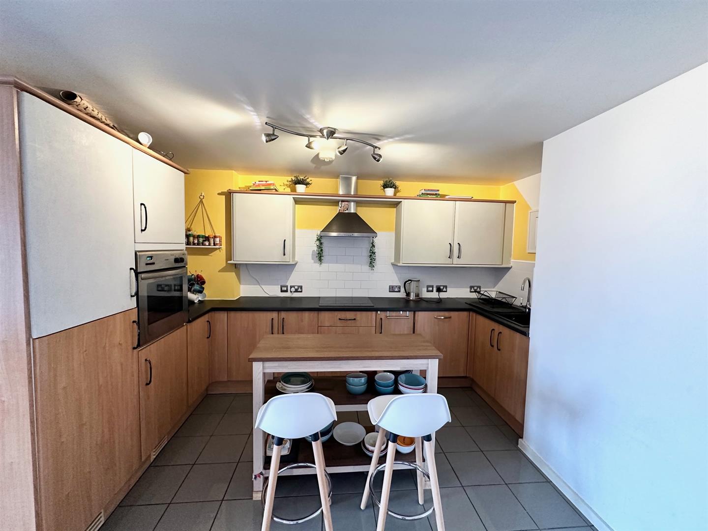 Lounge Kitchen - Double glazed windows, 2 x electric wall heaters, laminate flooring, kitchen area comprised of a range of fitted base and wall units with integrated fridge/ freezer, dishwasher, electric oven, electric hob, extractor hood,kitchen island with 2 stools, furnishings include L shaped sofa, dining table with benches, tv stand