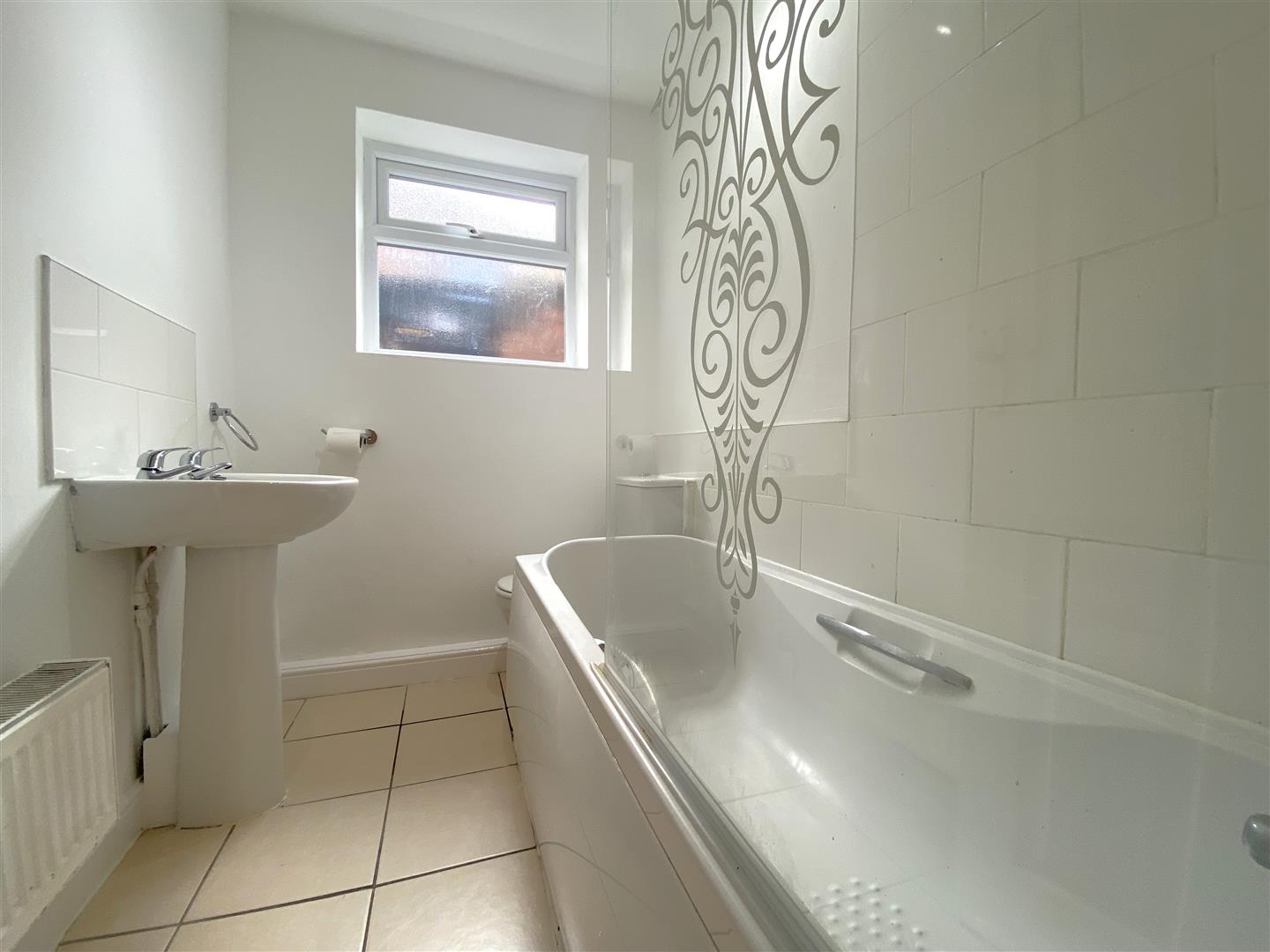 Bathroom - Double glazed window, WC, basin, radiator, tiled floor & bath with electric shower.