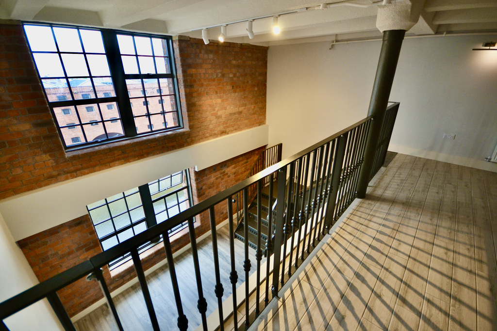 Each unit features double - height living rooms with mezzanine floors linked by architecturally designed staircases. Exposed industrial concrete ceiling beams, pillars and brick walls are retained throughout.