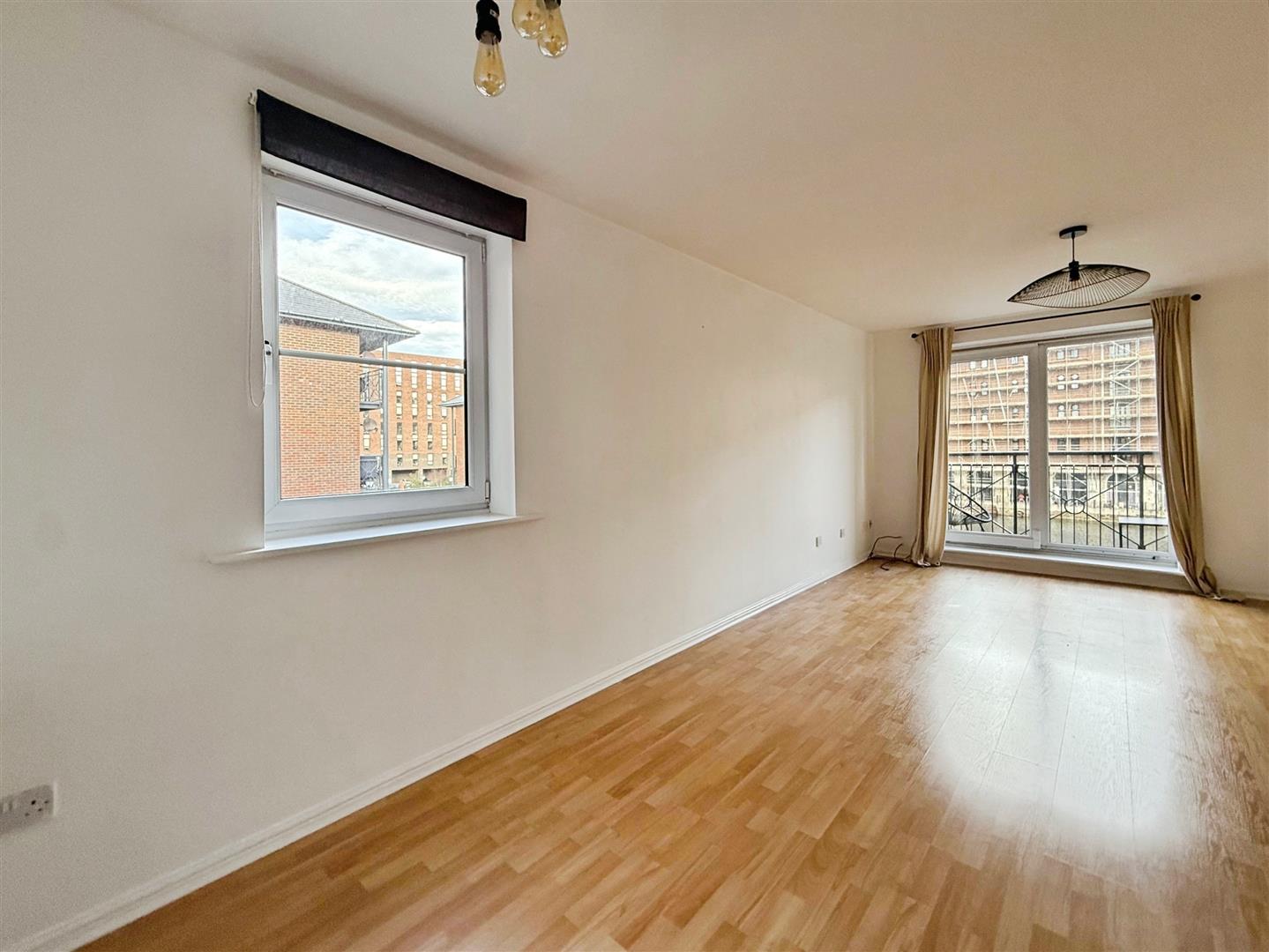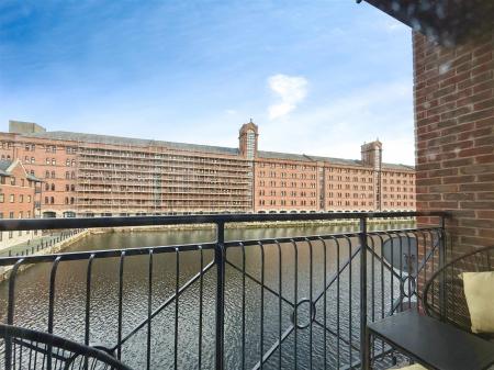 The property is in good condition and features an open-plan reception room with large windows and access to a **waterfront balcony**, providing attractive views over the docks. This space is well-suited to modern living and dining arrangements, particularly for professionals seeking a city base with a relaxed waterside outlook.