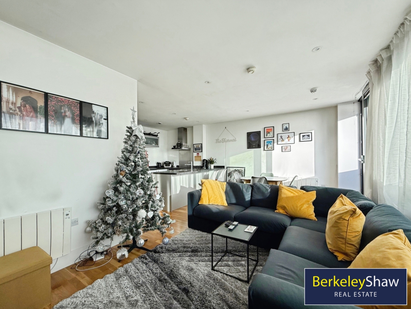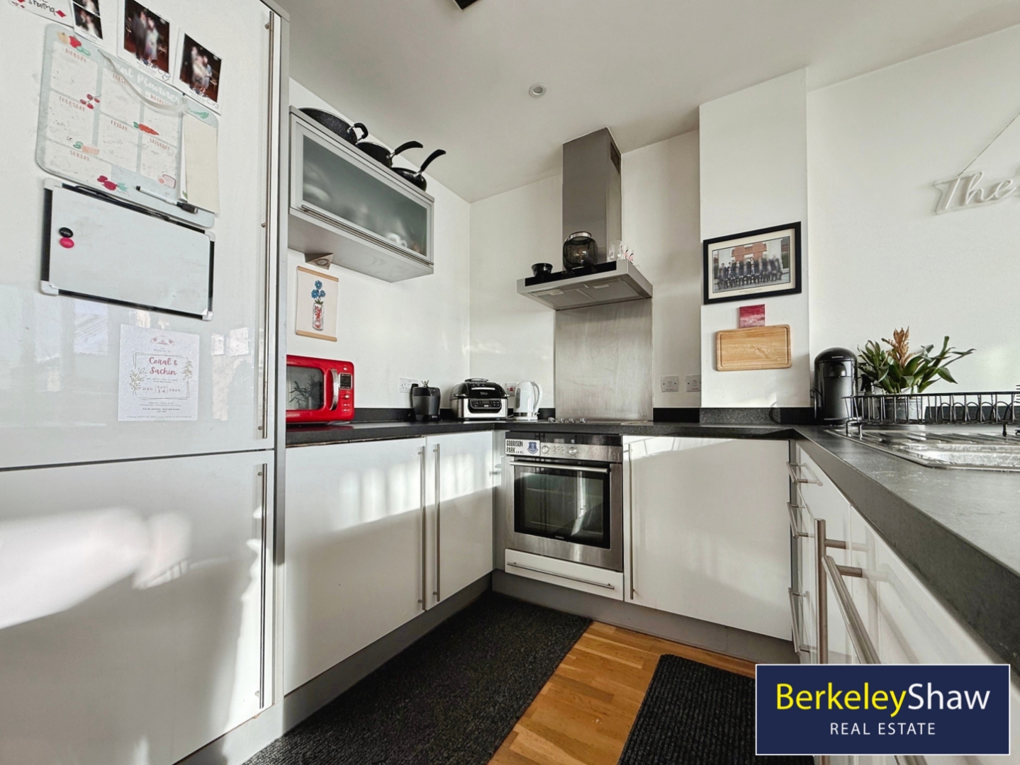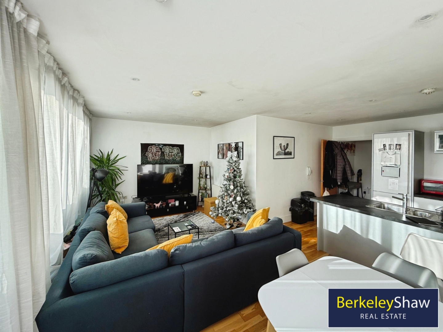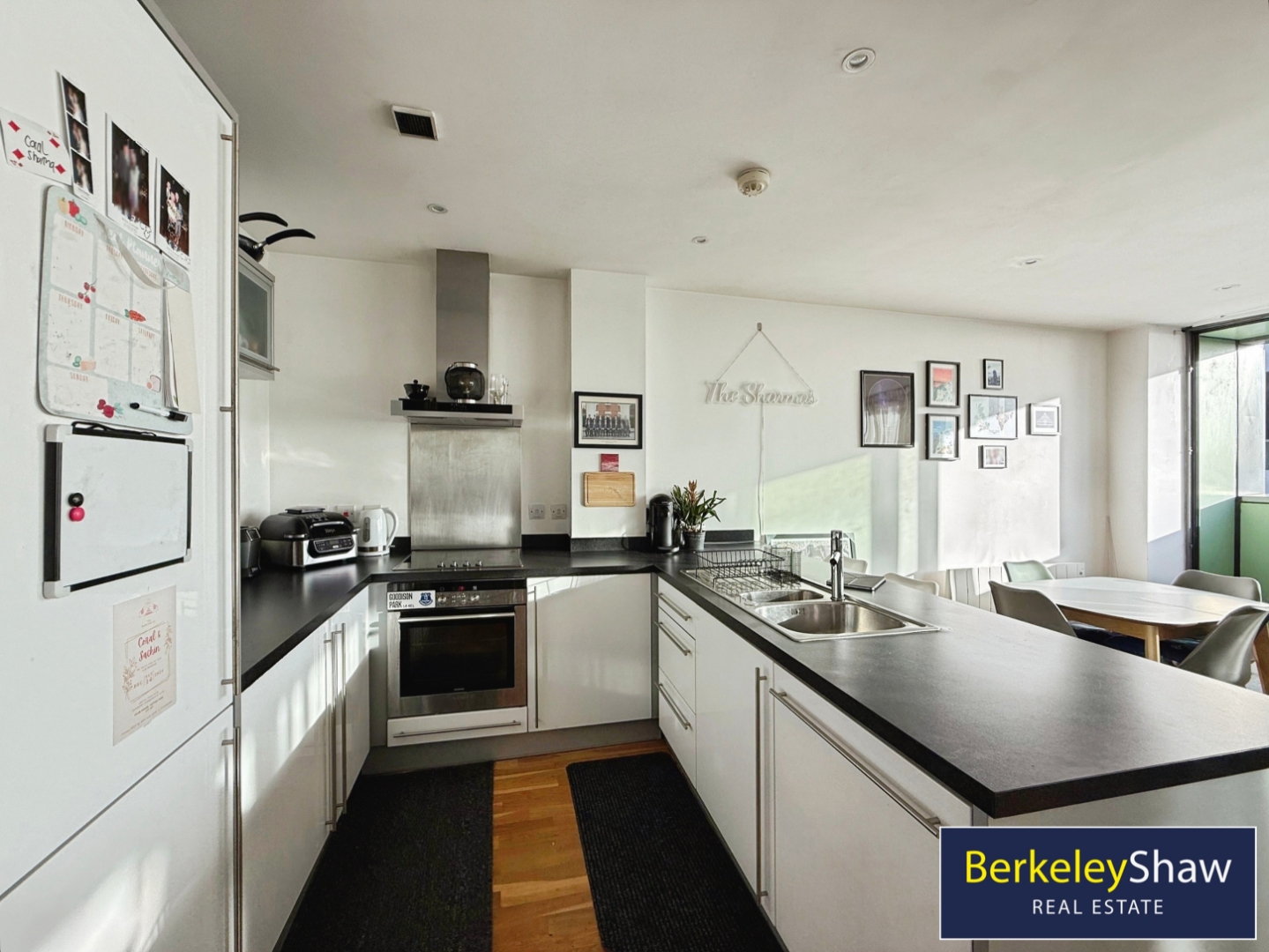 Set across two floors, the open-plan reception room features large windows that maximise natural light and frame the city skyline, flowing into an open-plan kitchen with kitchen island and good natural light - ideal for everyday living and entertaining.