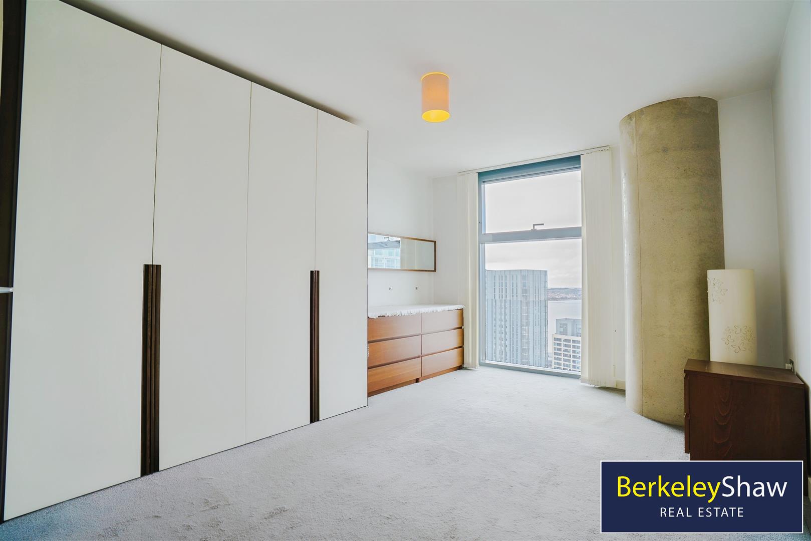 Bedroom 2 - double glazed floor to ceiling windows, carpet, large wardrobes, chest of drawers and bedside table