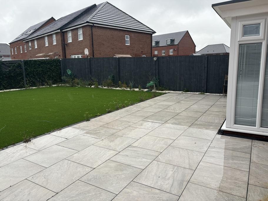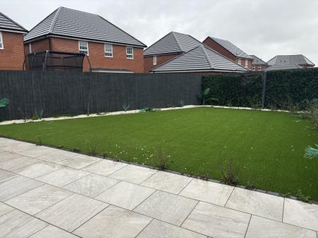 The ground floor features an inviting entrance hallway, a spacious living room, a convenient downstairs W/C, and a modern fitted kitchen with a dining area that includes integrated appliances and a utility room with white goods. French patio doors, adorned with custom blinds, open to a paved patio area and an artificial grass lawn.