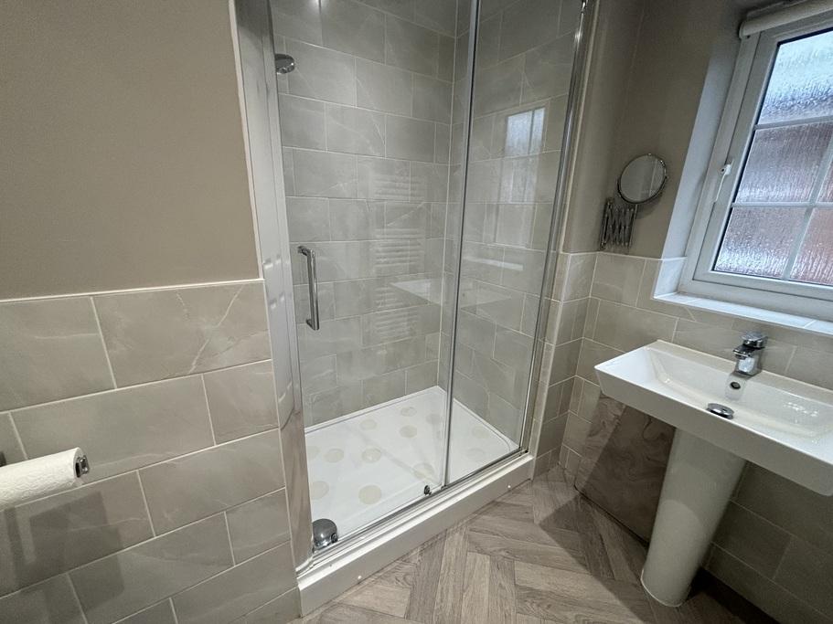 Upstairs, the main bedroom includes fitted wardrobes and an en-suite bathroom. Three additional double bedrooms share a family bathroom complete with a walk-in shower, toilet, hand basin, and bath.