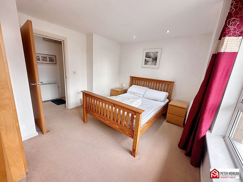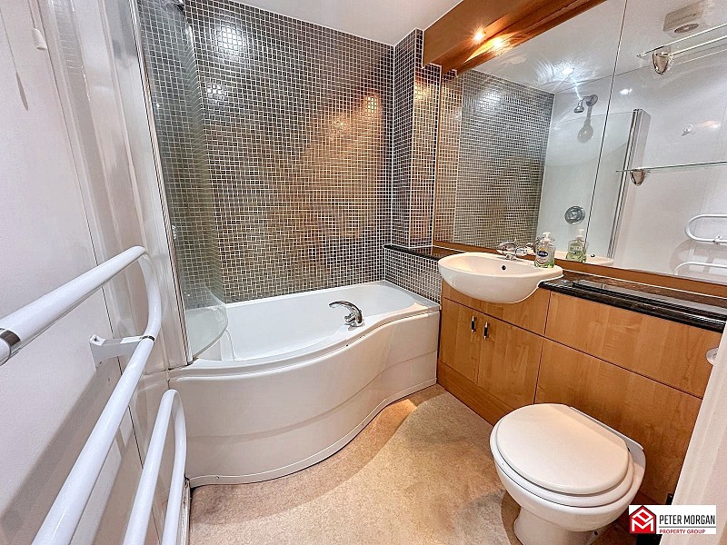 Both bedrooms are generously sized and furnished for immediate move-in, while the contemporary family bathroom includes a full-sized bath with overhead shower, wash basin, and toilet.