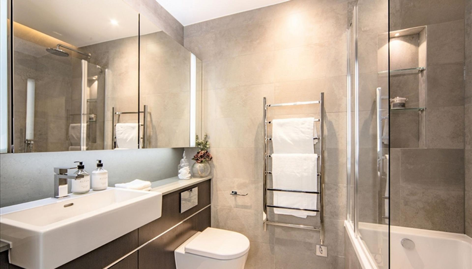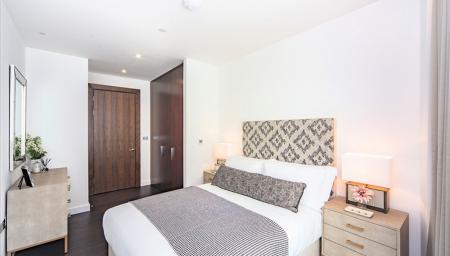 The apartment comprises a spacious reception room complete with Samsung Smart TV's with Bose sound bars incorporating a built in Amazon Alexa to control the apartments lighting, TV and heating systems along with a private balcony. The reception room is open plan with a fully fitted kitchen featuring integrated AEG appliances with floor to ceiling windows providing far reaching views across London. The apartment offers two double-bedrooms, two-bathrooms, one of which is an en-suite bathroom from the master bedroom. The apartment also benefits from ample storage space.