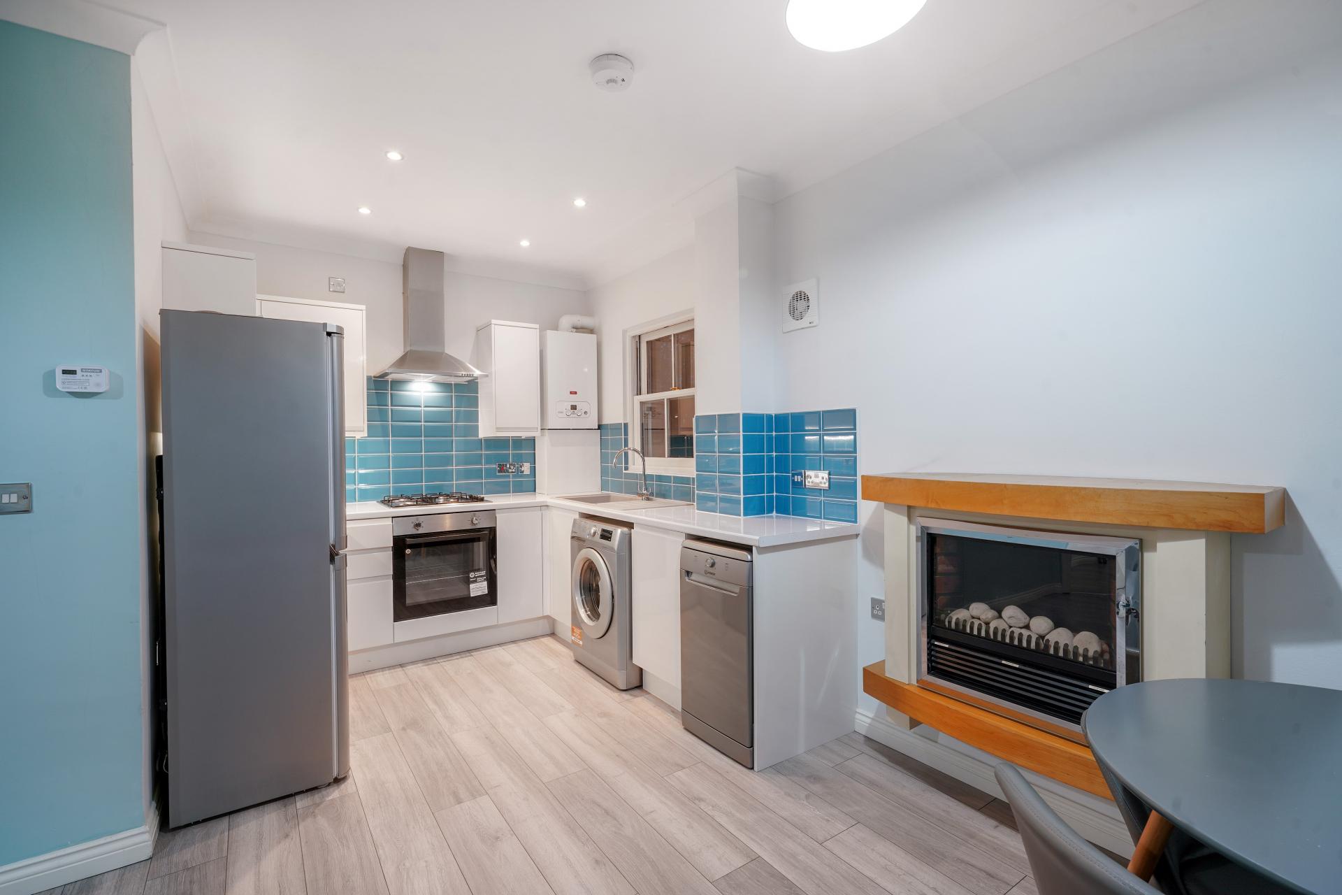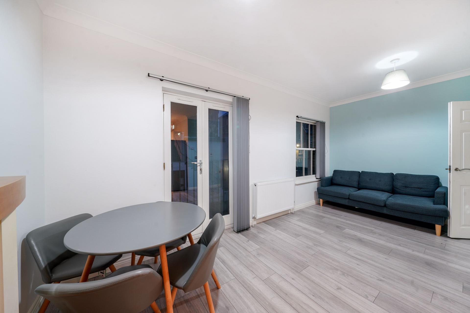 Two bedroom first floor apartment available to let. Open plan living kitchen space, white gloss kitchen, full applianced with dishwasher, washing machine and fridge freezer. Wooden flooring throughout, one double bedroom and a smaller second bedroom. Fully tiled bathroom with walk in shower cubical. Gas central heating and double glazing. The property is available furnished and is conveniently located 1 minute walk from Bow Church DLR station. Internal Viewing highly recommended. EPC BAND C. Council Tax Band D.