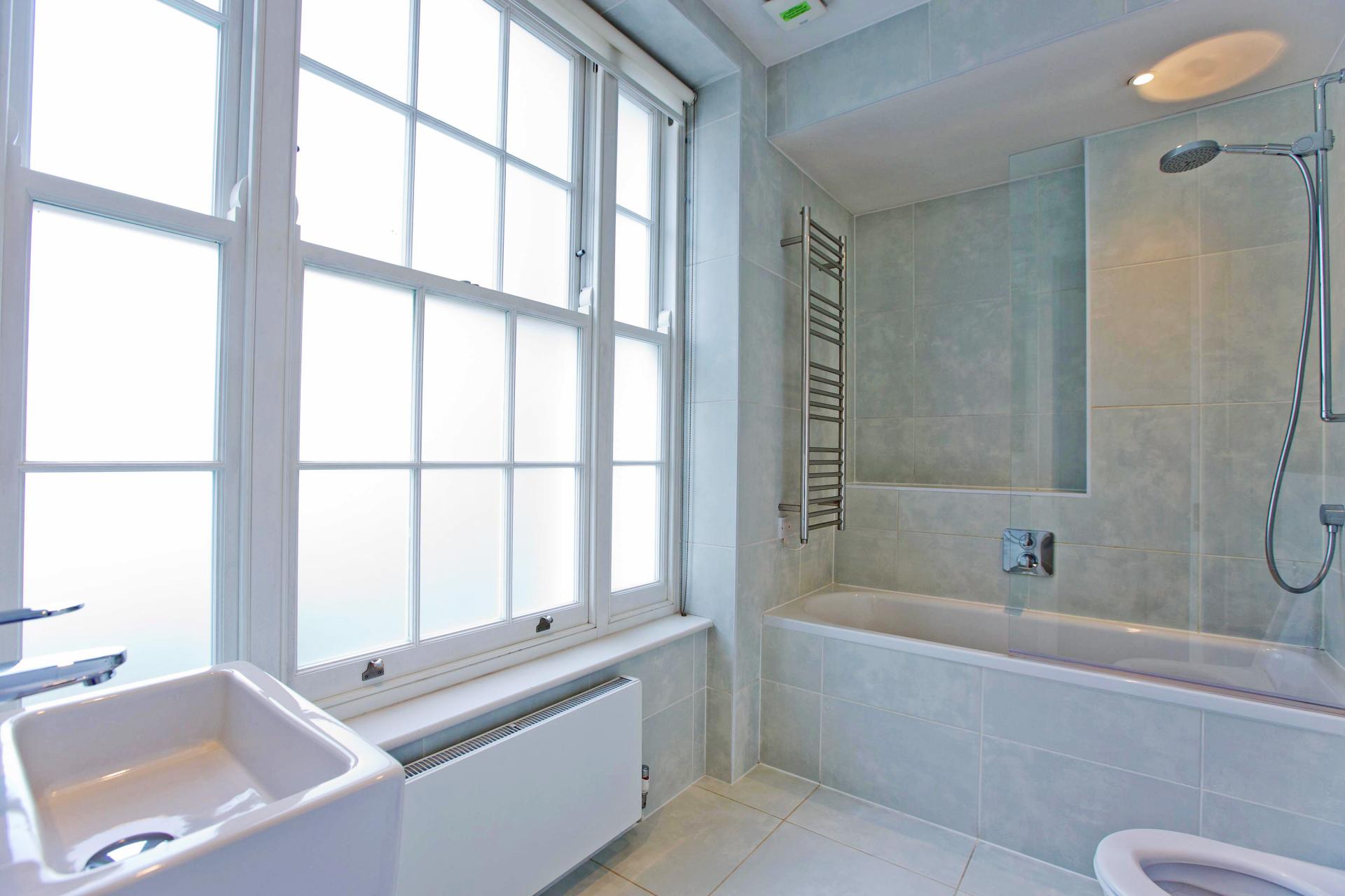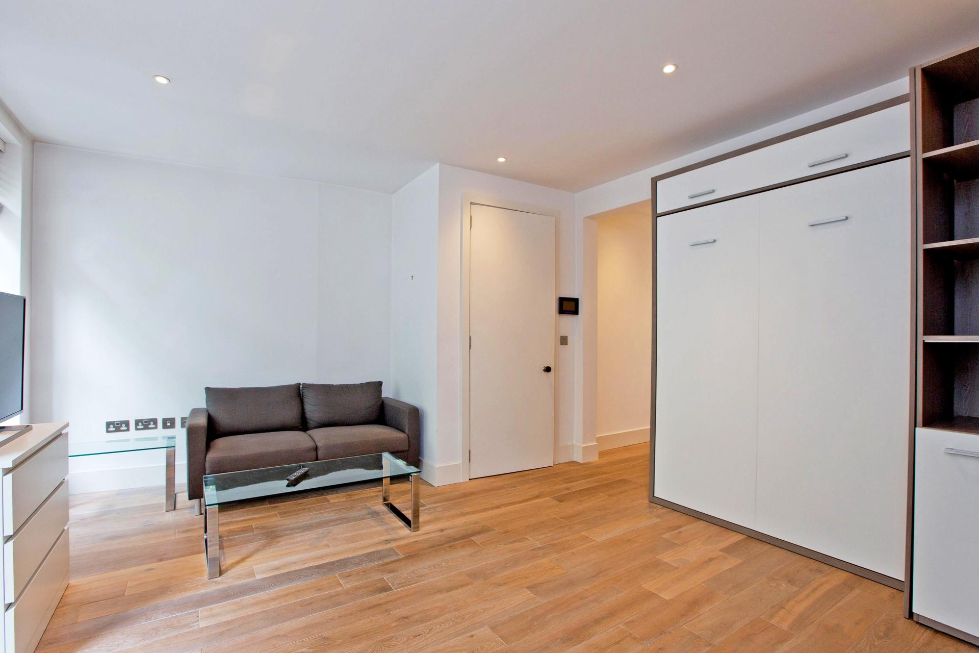 Lovely, own entrance contemporary ground floor studio with open plan kitchen, wood flooring, and separate modern shower...