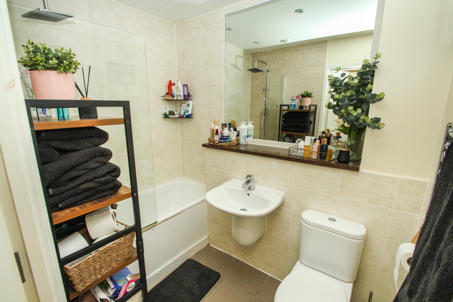 Heading down the hall, before reaching the reception there is a large storage cupboard followed by the modern three piece bathroom suite.