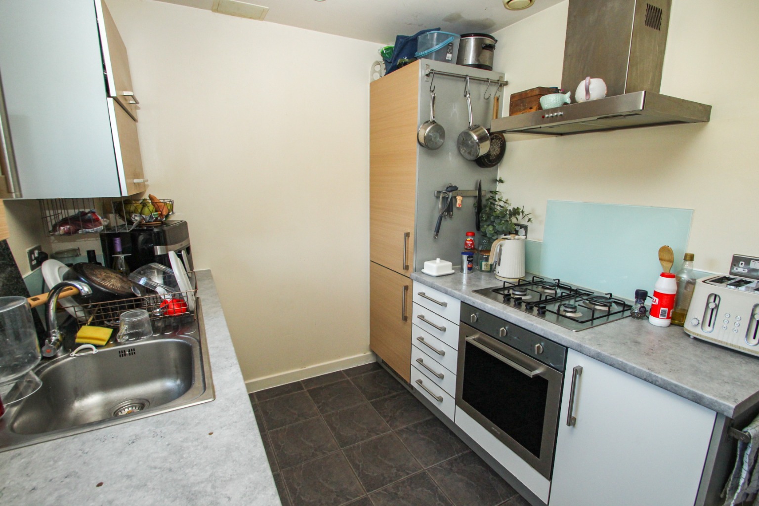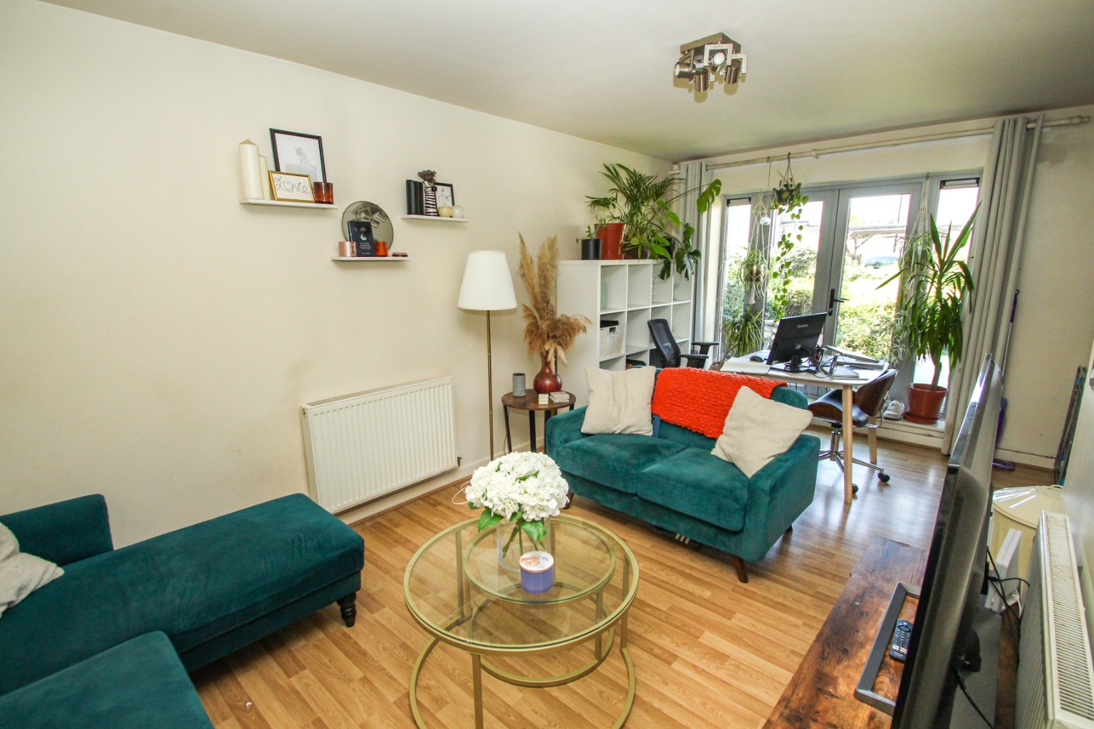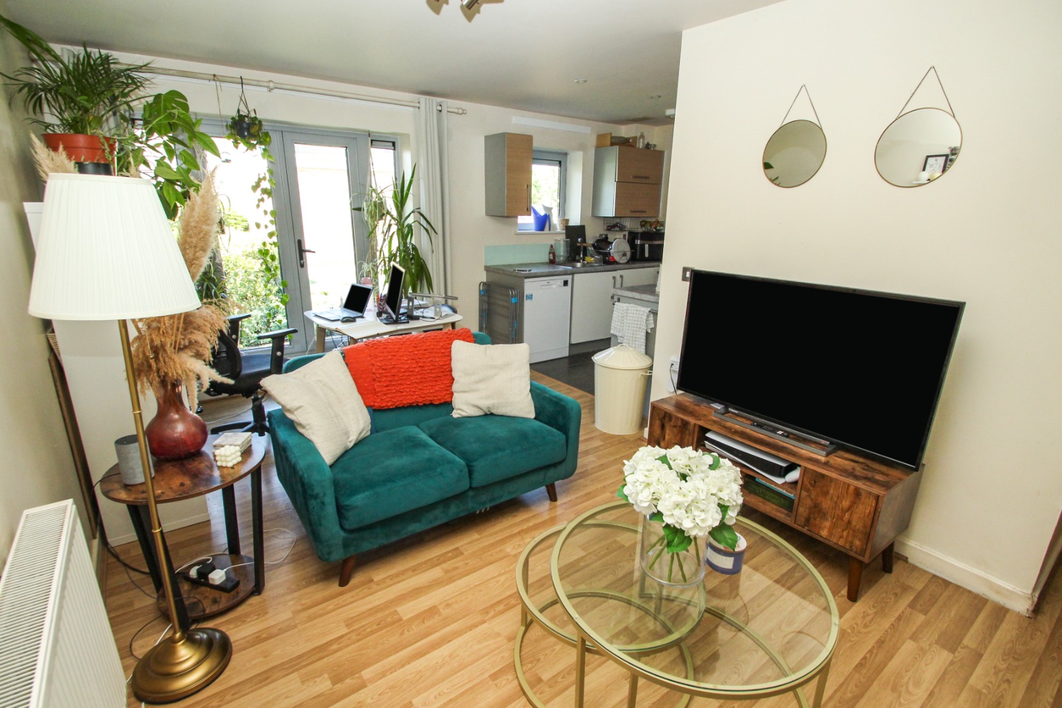 The reception room is large enough for both a seating and dining area and with the open plan style of property forming an ‘L’ shape into the fitted kitchen which comprises of Gas hob, Oven, integrated Fridge/Freezer and washing. There are also patio doors from the reception leading out to a small paved area, beyond which is a well maintained rear communal area.