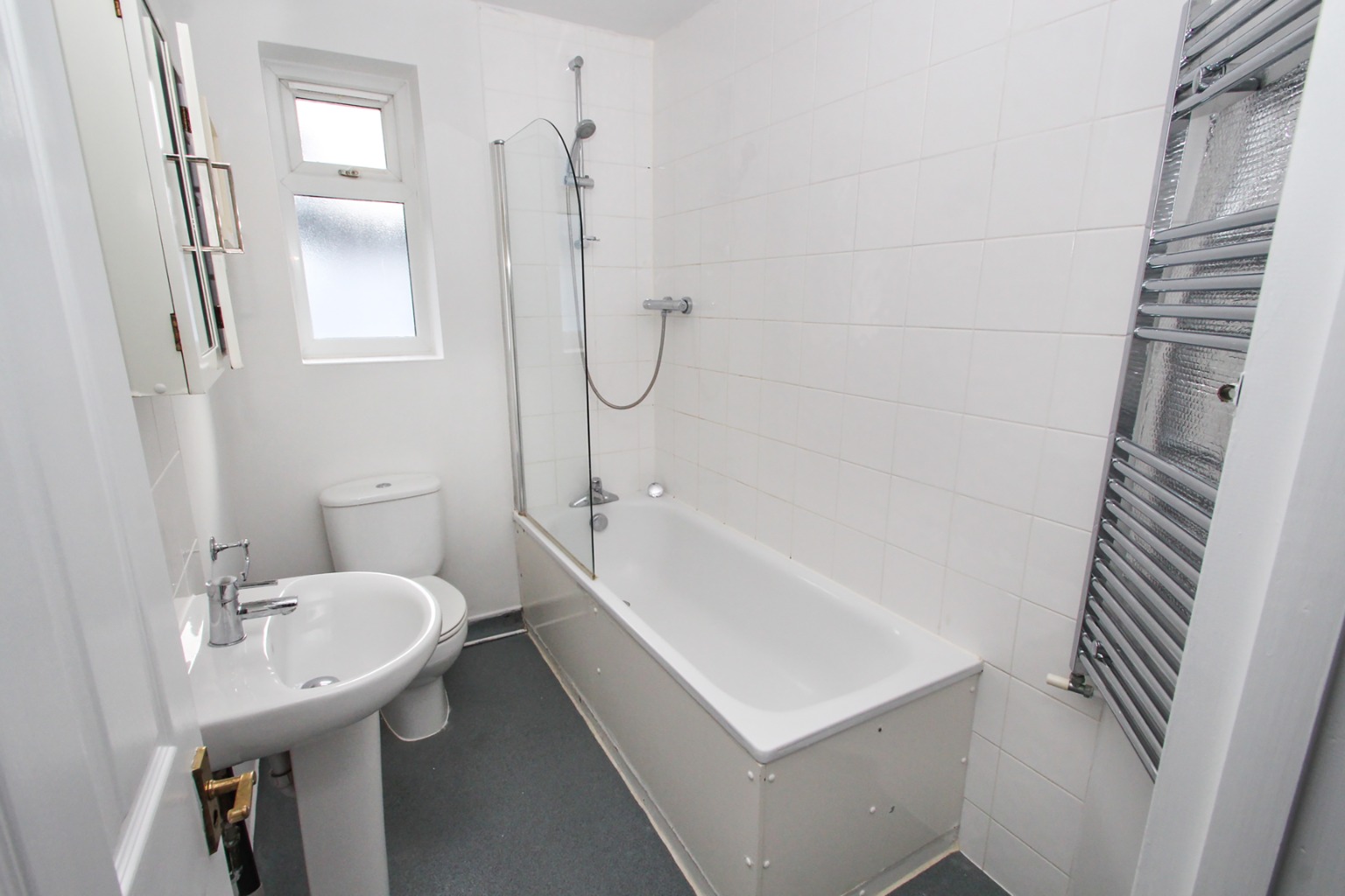 The three piece bathroom suite also includes a mounted heated towel rail, mirrored toiletries cupboard above the sink, shower fitting and glass splash to the bath.