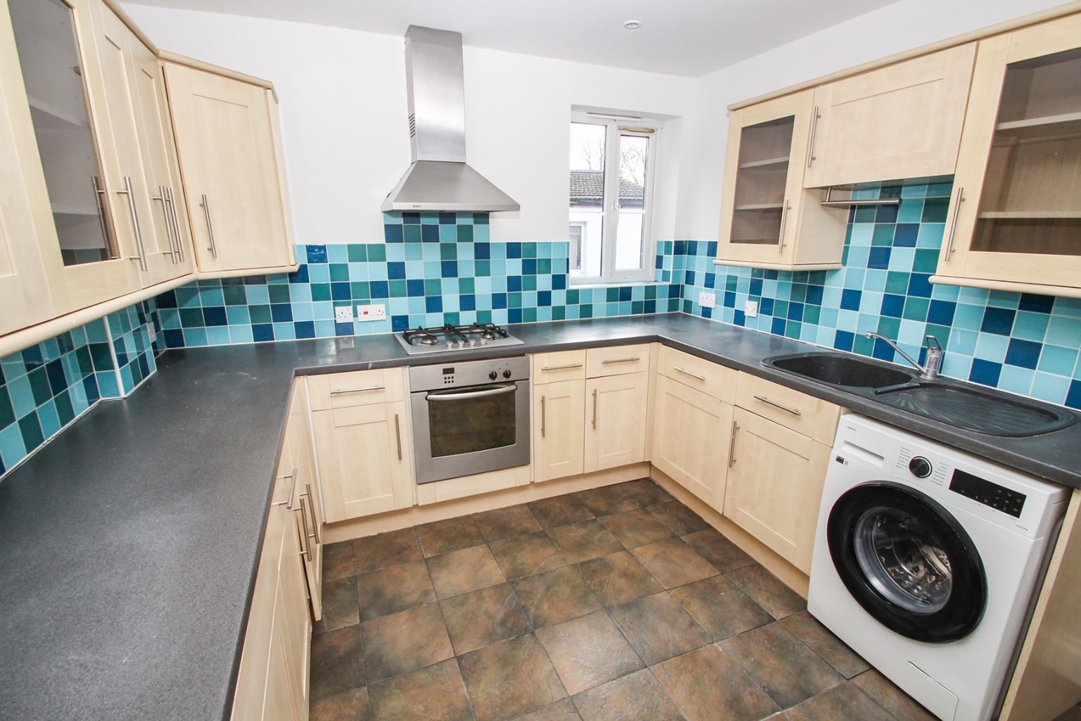 To the centre of the property is the fully fitted kitchen, offering an abundance of cupboard space and includes all the necessary white goods; Oven and gas hob with overhead extractor, separate under the counter fridge and freezer, washing machine and dishwasher, what more could you need!