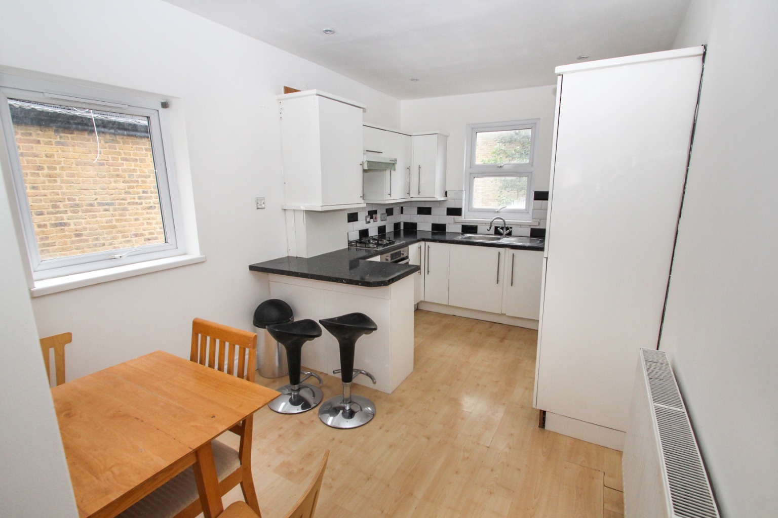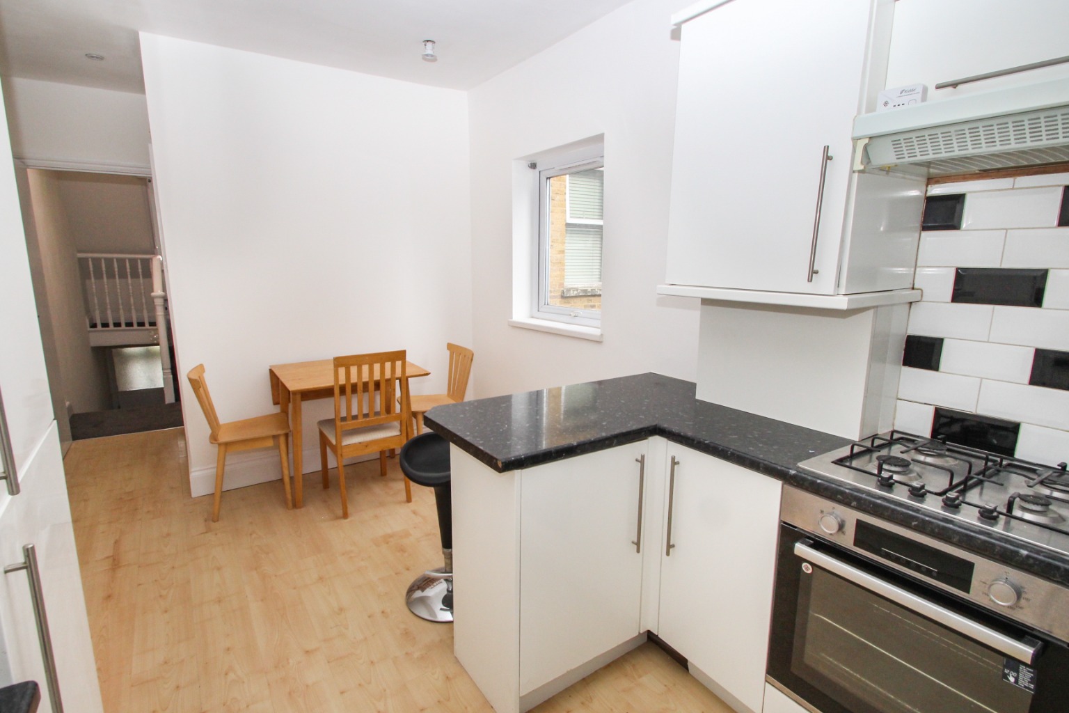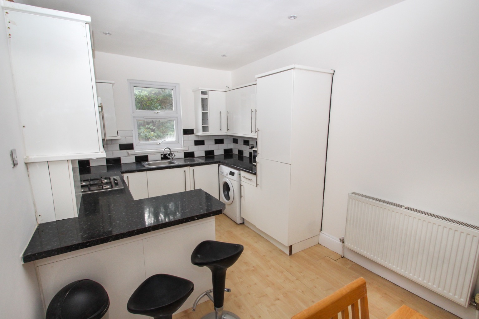 Situated across the first and second floors of a converted period house, there’s a kitchen/diner to the rear of the property with space for a small table and chairs, plus there’s a breakfast bar. The kitchen comes with a gas hob, overhead extractor, electric oven, fridge/freezer and a washing machine.