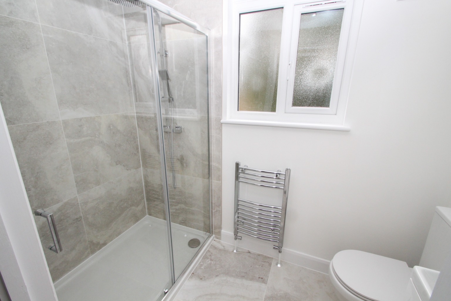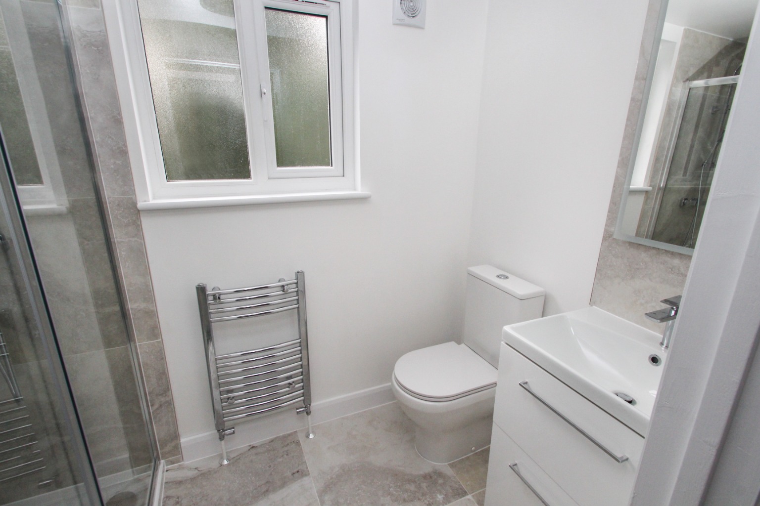 Also on the first floor level, there’s a fully tiled and remodelled shower room followed by two rooms, one stretching the width of the property and a further double sized room, both of which are carpeted and either of which could be used as a bedroom or living room.