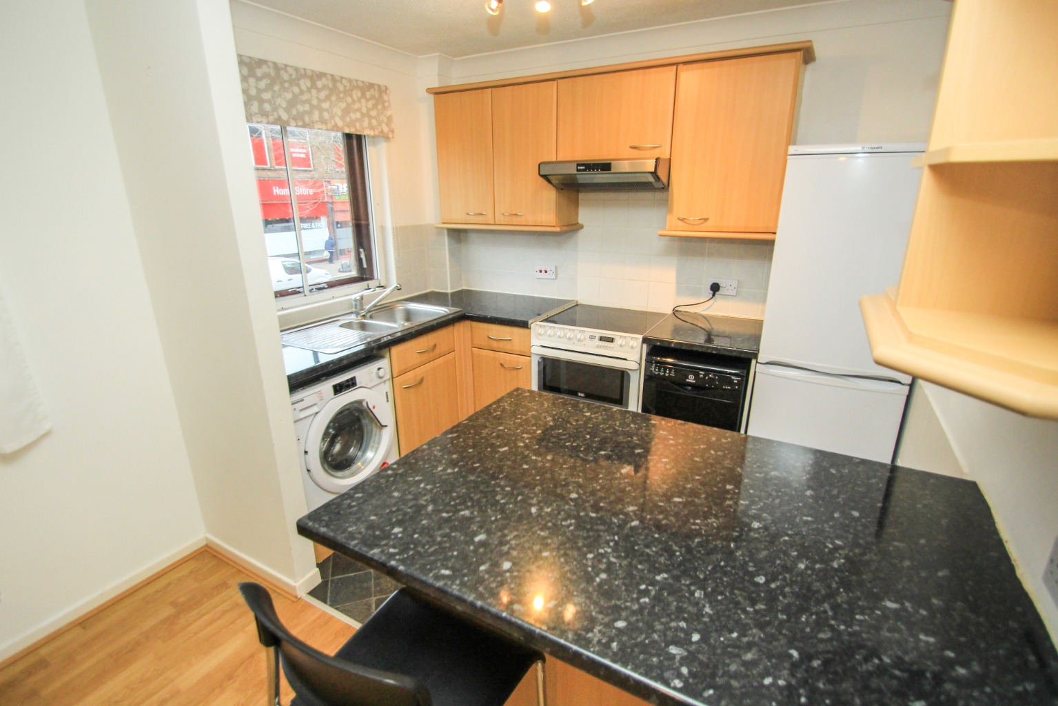 The reception is reasonably large, and is open with the kitchen which is laid with laminate flooring. The reception comes furnished with a sofa, a couple tables, side tables and stools. The kitchen is fully equipped with all white goods which include an electric hob and oven, a fridge freezer, washing machine and better yet a dishwasher.