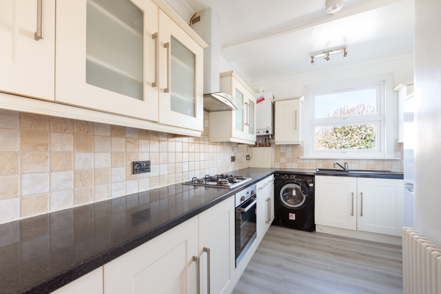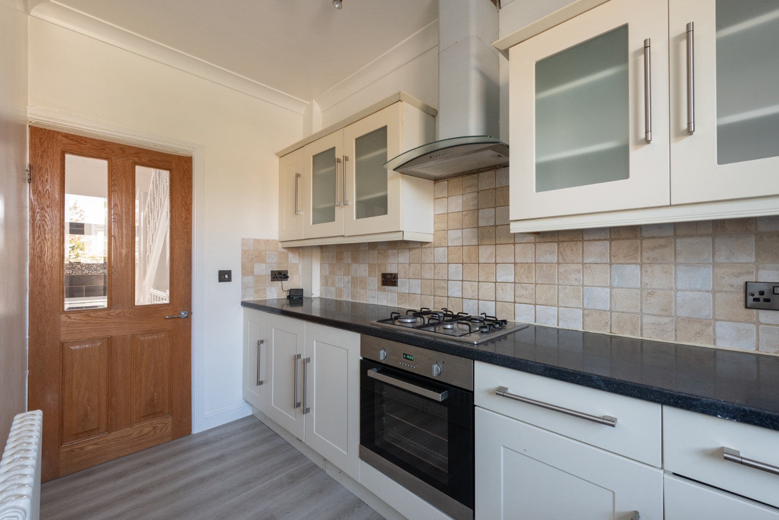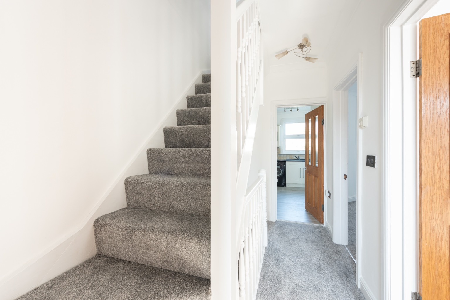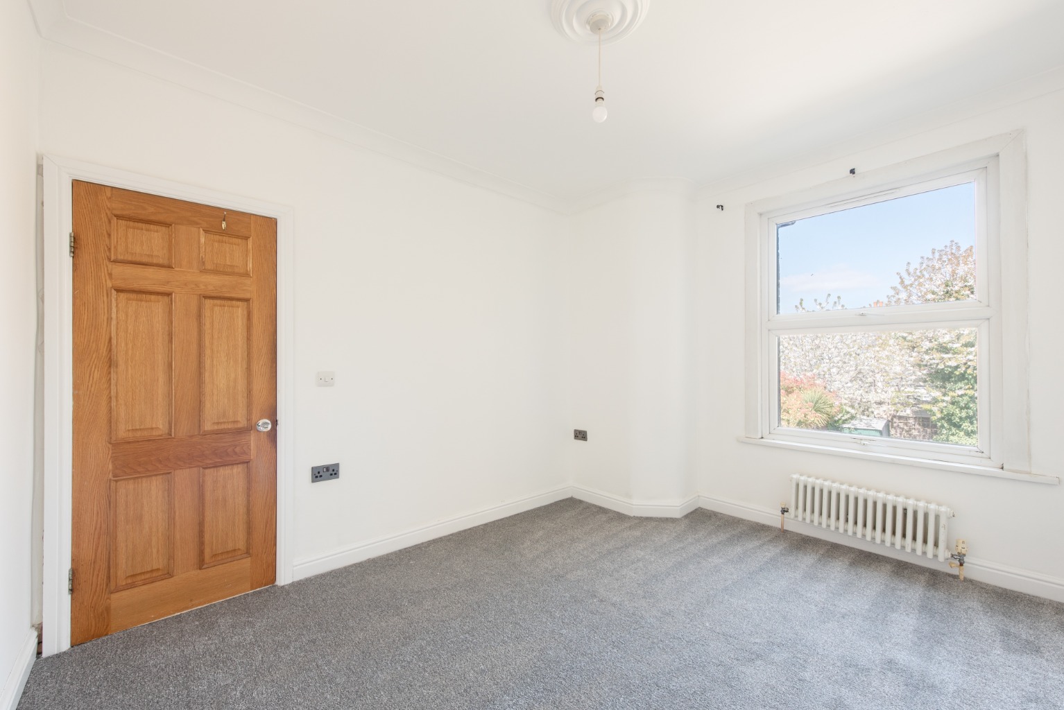 This two bedroom unfurnished split level flat sits on a quiet street with residents’ only parking, with a small front garden leading to a shared porch and to the flat’s front door.