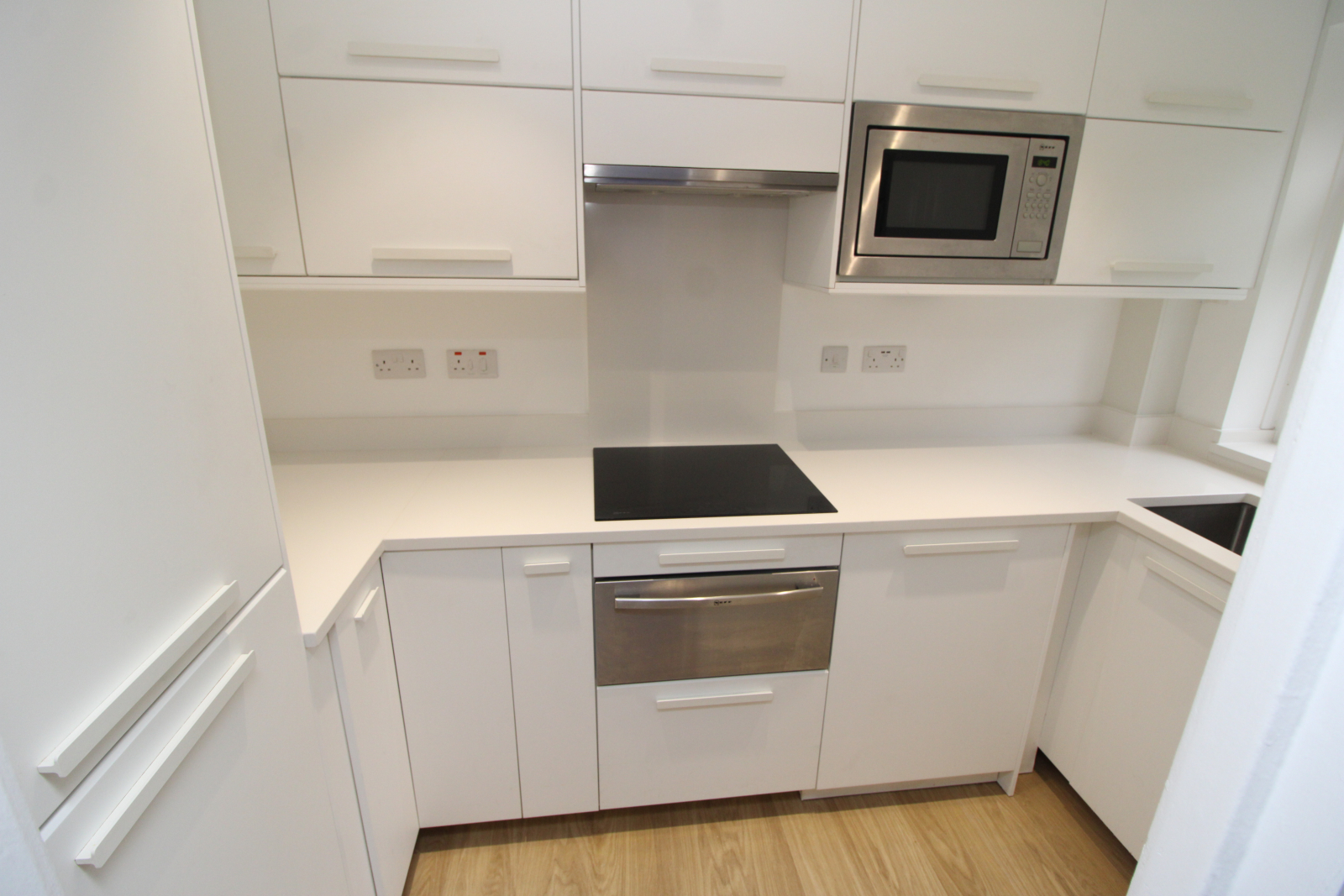 The contemporary fitted kitchen is finished with granite worktops and offers a full range of high-spec integrated appliances, including a large fridge freezer, washing machine, dishwasher, Neff hob, oven, grill, and microwave.