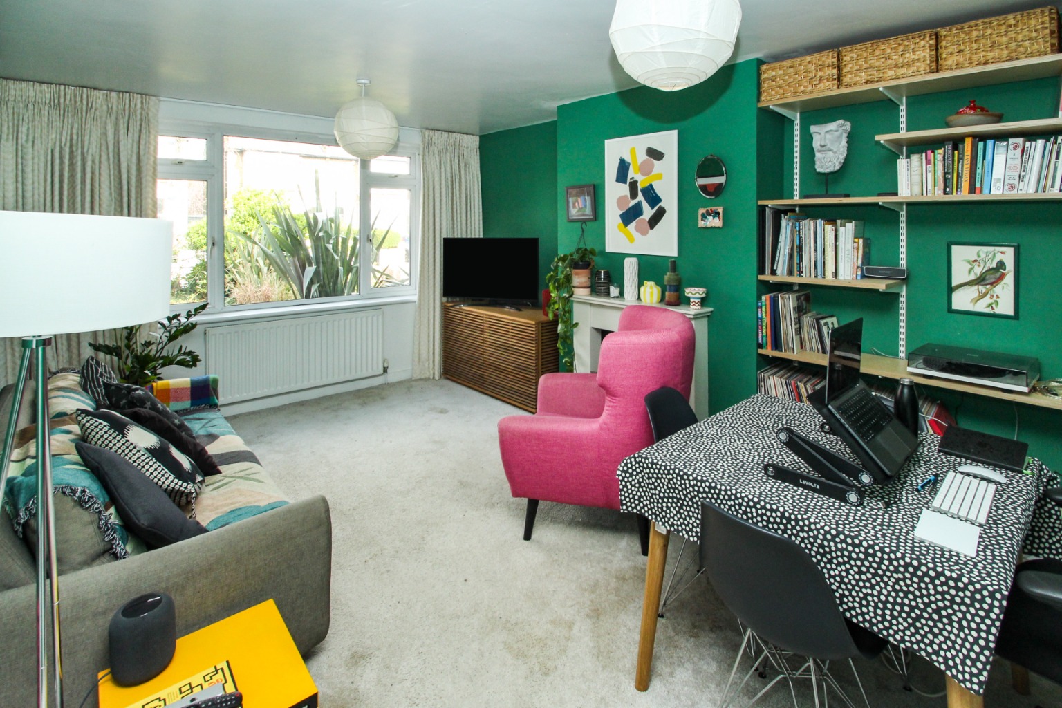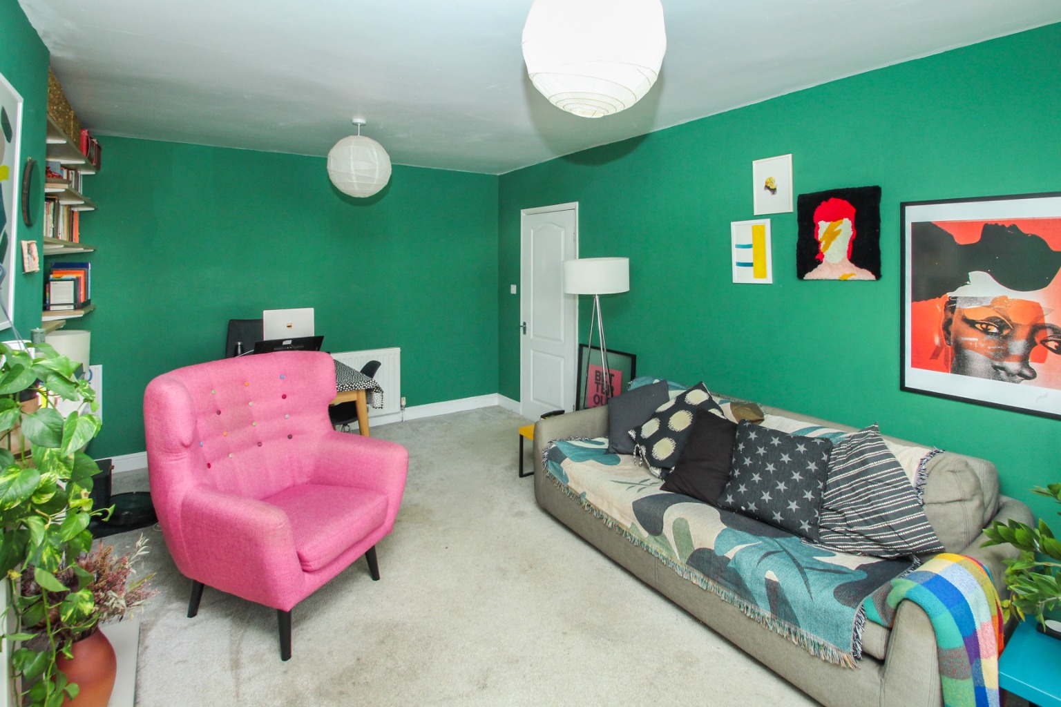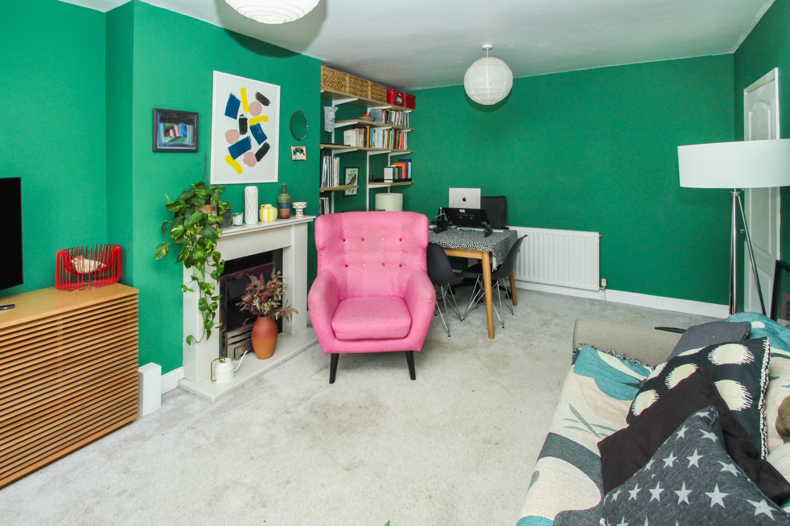 To the left is the generously proportioned reception room, with luxurious carpet underfoot, feature fireplace, and in-built shelving this is a wonderful room to relax with enough space to add a small dining table.