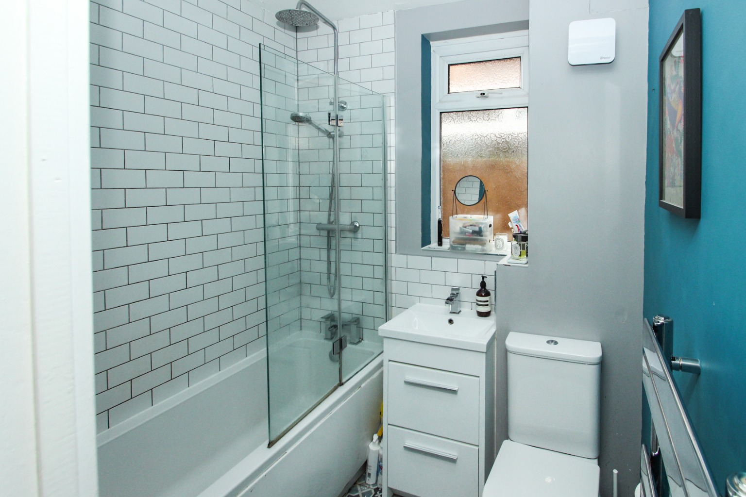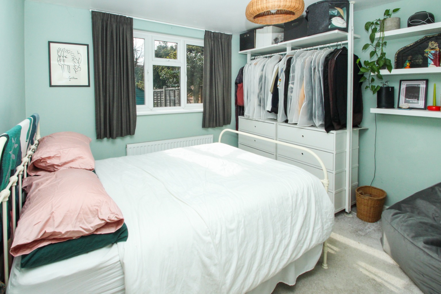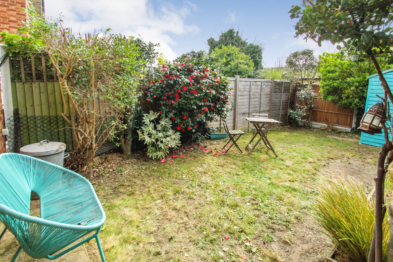 Heading to the rear of the property, the three piece bathroom suite has a stylish overhead shower fitting plus removable fitting, with glass splash screen and handy storage under the sink unit. Finally, the rear double bedroom is also carpeted and includes wall-mounted shelving, exposed clothes rail, and double draw units for storage and overlooks the pretty rear garden. The garden is mainly laid to lawn with low maintenance bedding and a shed, which is a private space to enjoy those warmer months.