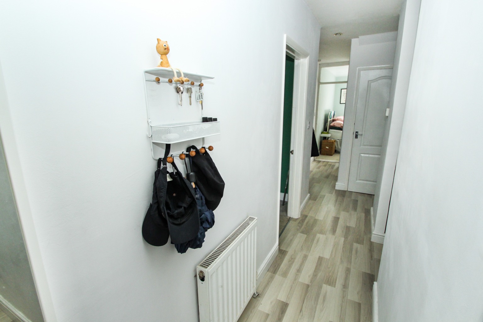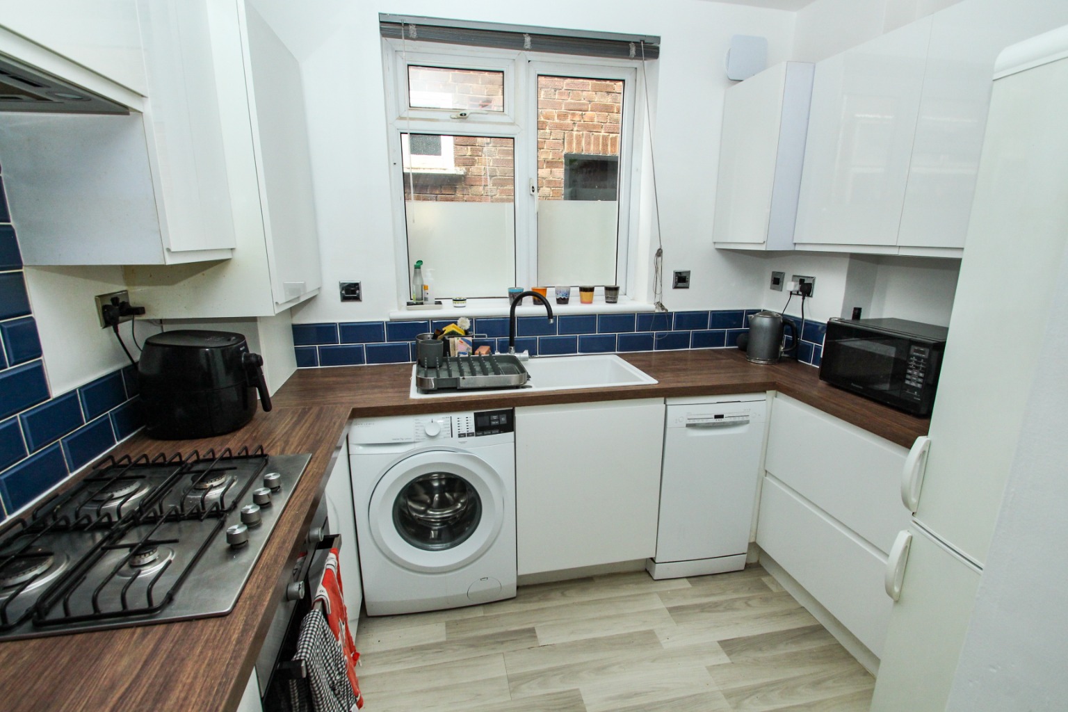Heading down the hallway, to the right is the modern fitted kitchen with the essential white goods, including Gas Hob and an Electric Oven with Overhead Extractor, Washing Machine, and Fridge/Freezer.