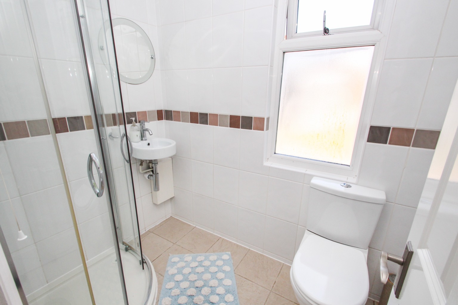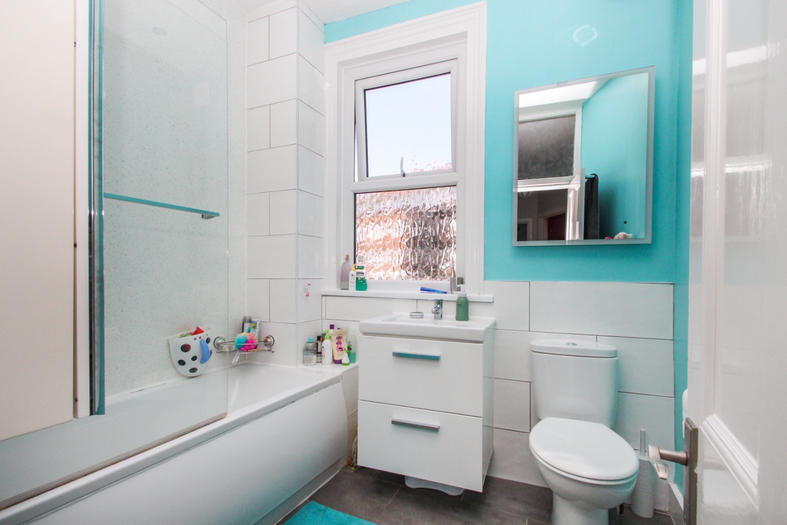 Heading up to the first floor, a good sized landing provides access to a family bathroom which is fully tiled to the sink and bath area, shower fitting to the bath with glass shower screen, storage cabinet fixed the wall with additional storage under the sink plus a large mirror with internal light.