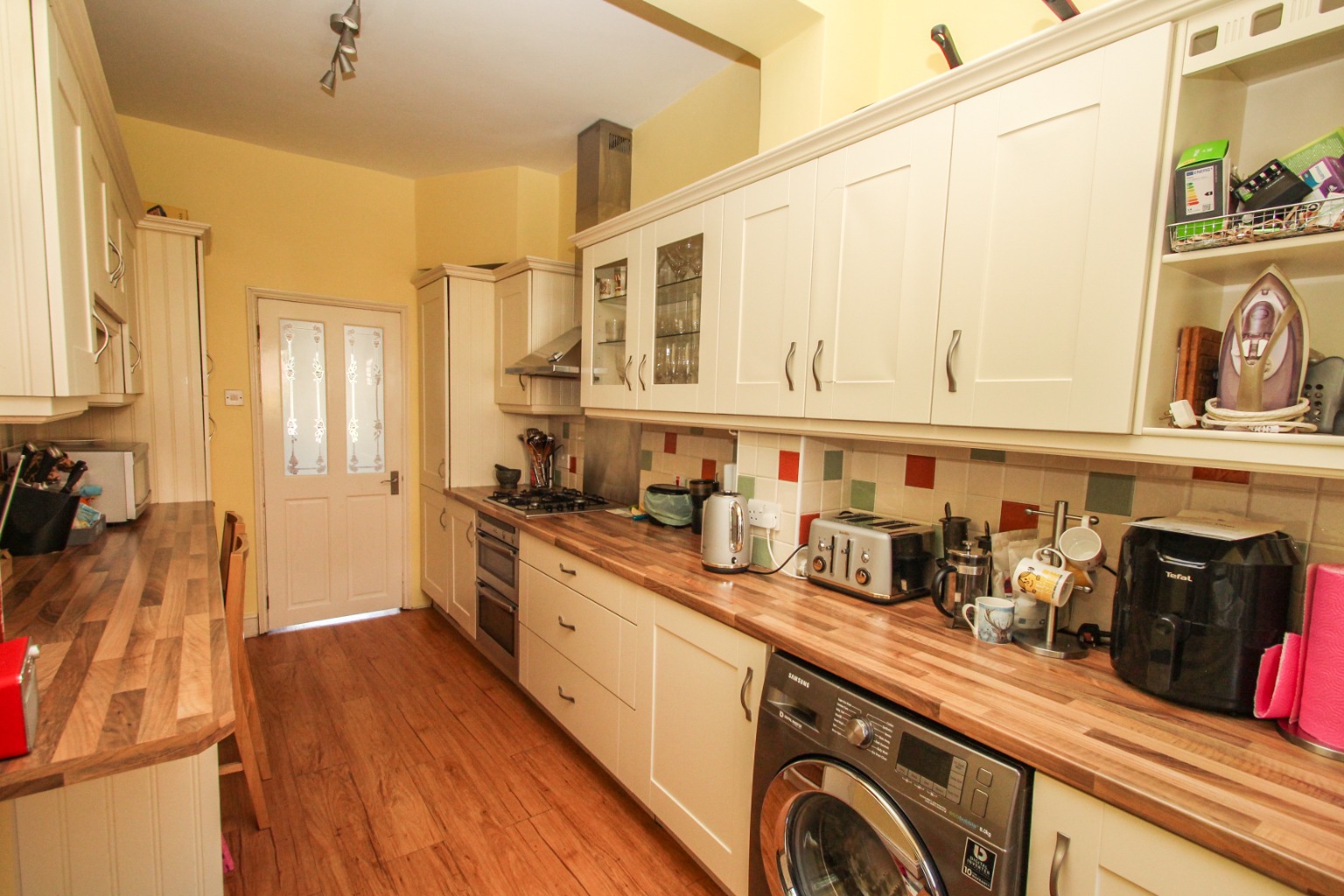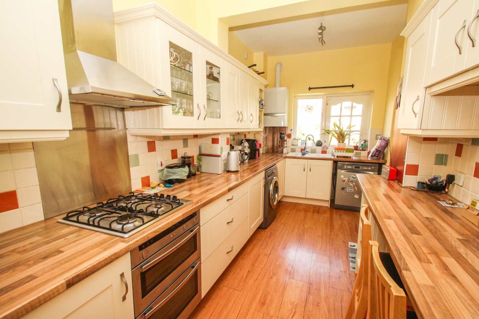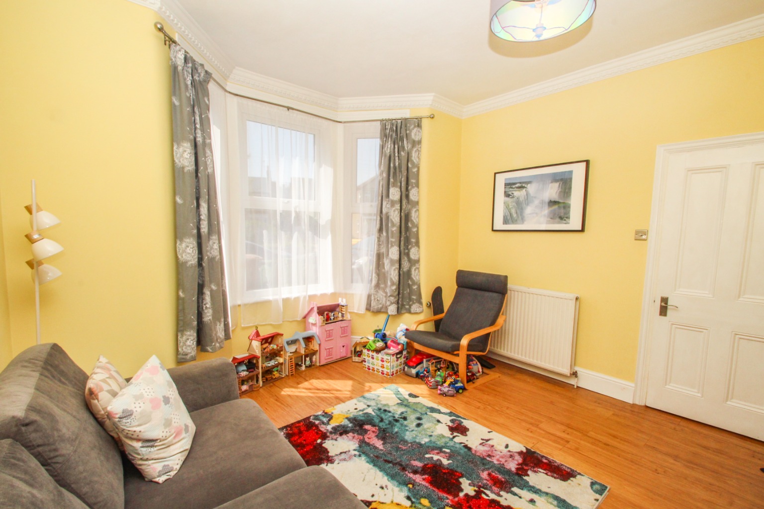 Inside the property, a spacious light-filled entrance provides a place to hang coats revealing the painted staircase leading upstairs and to the right the first of the two reception rooms. Neutrally decorated, this fabulous room has the Victoria style high ceilings and large bay window. To the rear of the ground floor, the second reception room could act simply as a dining room. However, its generous proportions space to accommodate a second seating area, ideal for larger families. The well-equipped kitchen also runs the full length of this room and includes plenty of cupboard space, breakfast bar area, integrated fridge/freezer, double oven, gas hob with overhead extractor, and dishwasher (washing machine upon request).