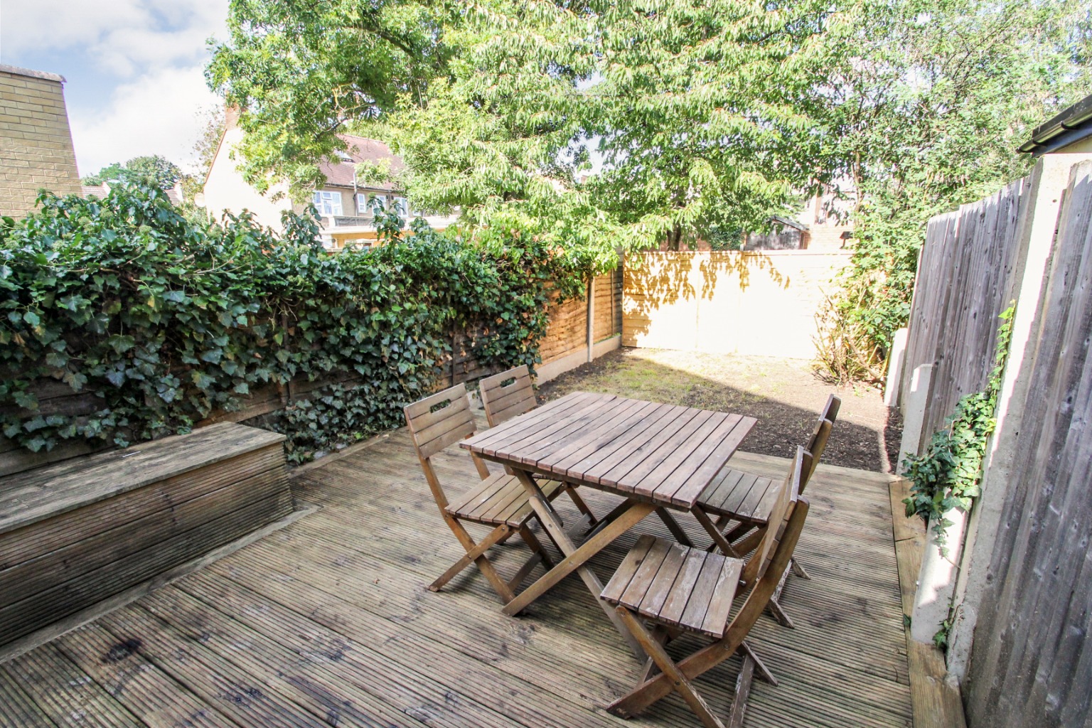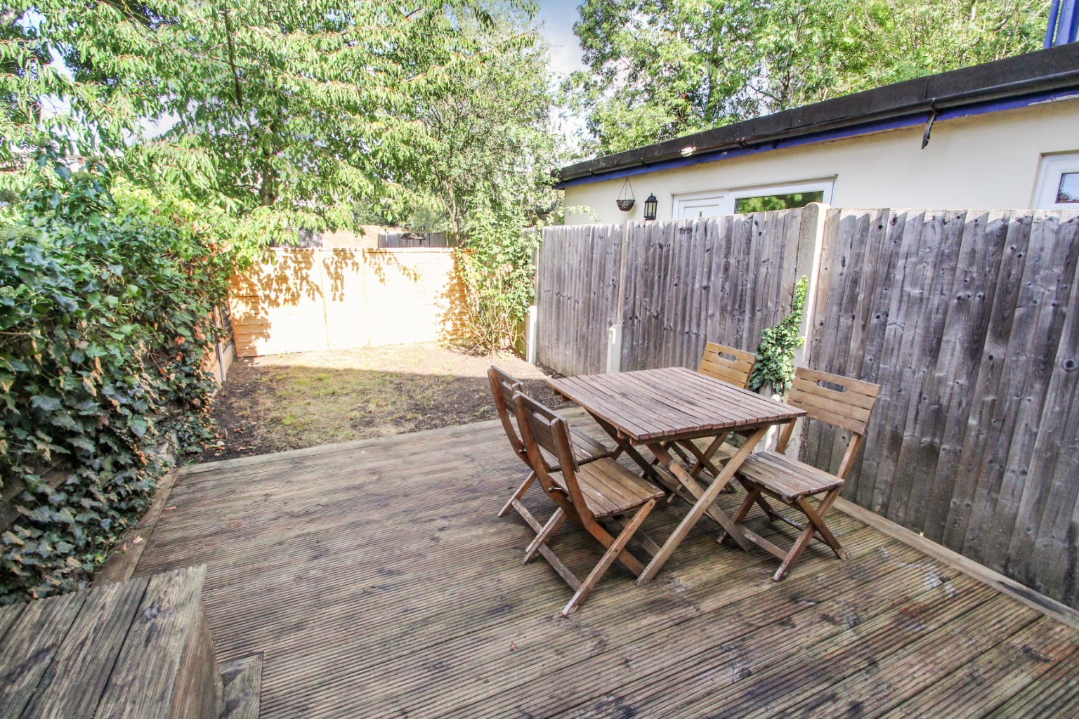 At the rear of the property the living room comes with built in shelving and storage, and patio doors leading out to the impressive rear garden, which has a raised decking area.
