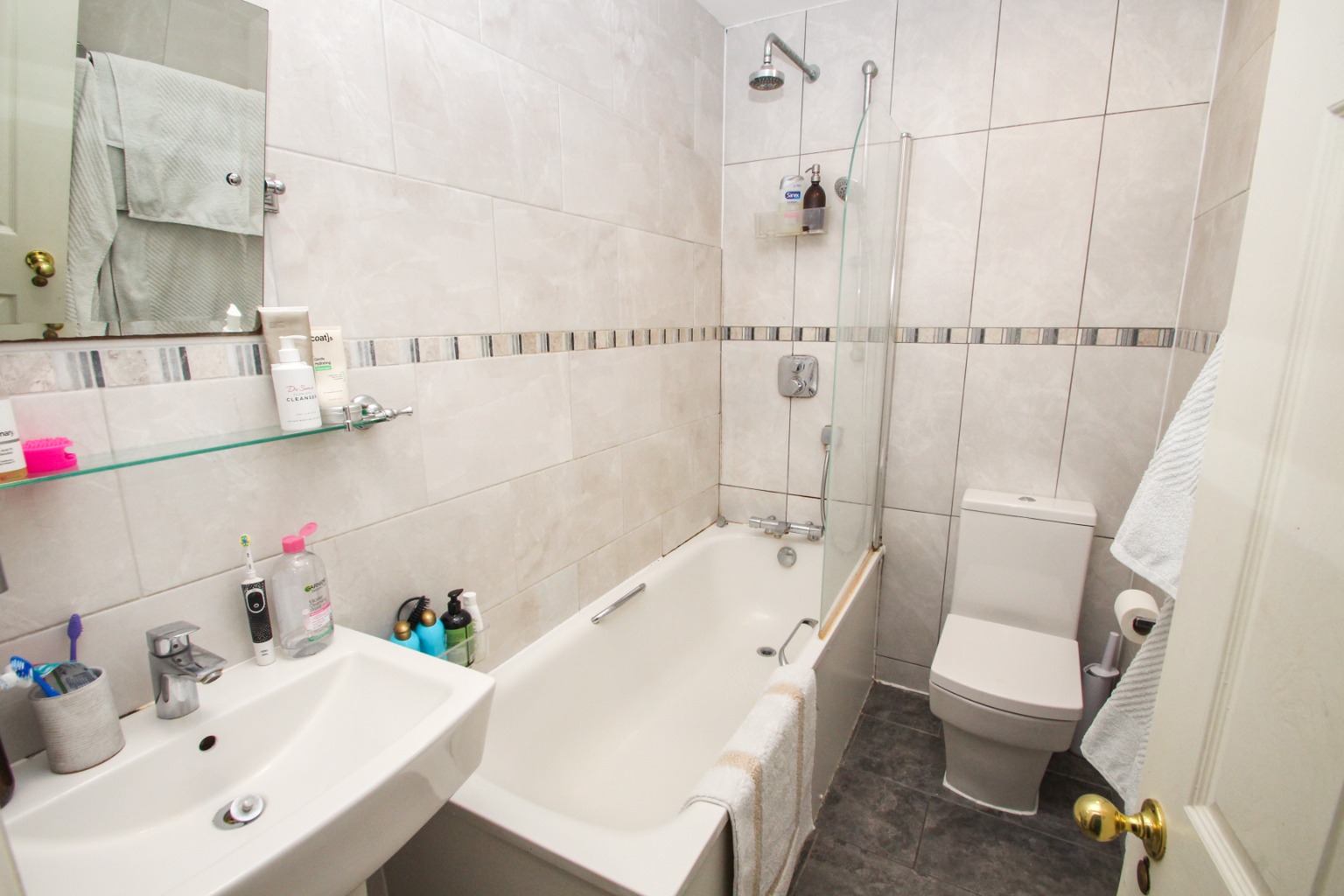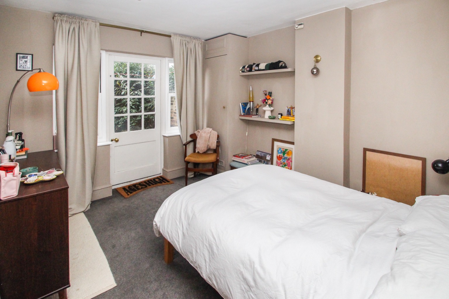 Heading to the rear of the property, the fully tiled three piece bathroom includes angled mirror above the sink and bath with overhead shower fitting and glass splash screen. To the rear of the property is the ample sized double bedroom with built in in wardrobes and additional draws for storage, some built in shelving and carpet. Access is also gained to the private courtyard rear garden.