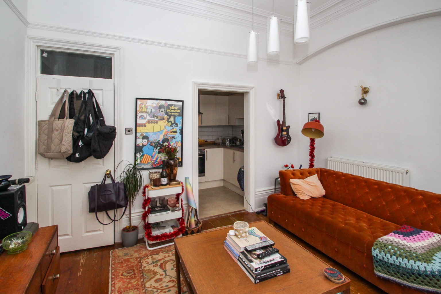 A large gravelled front garden area sets the property back from the road with the flat accessed via a communal hallway, positioned on the ground floor to the right. On entering the property there is initially an area handy for hanging coats before turning right towards the front of the property, revealing the light filled reception room due to the impressive bay window. With original floorboards under foot, high ceilings, original features and large unit with draws, it is a fantastic room to relax. The kitchen has a more modern style with plenty of cupboard space and includes electric oven and hob, with extractor, washing machine and fridge freezer.