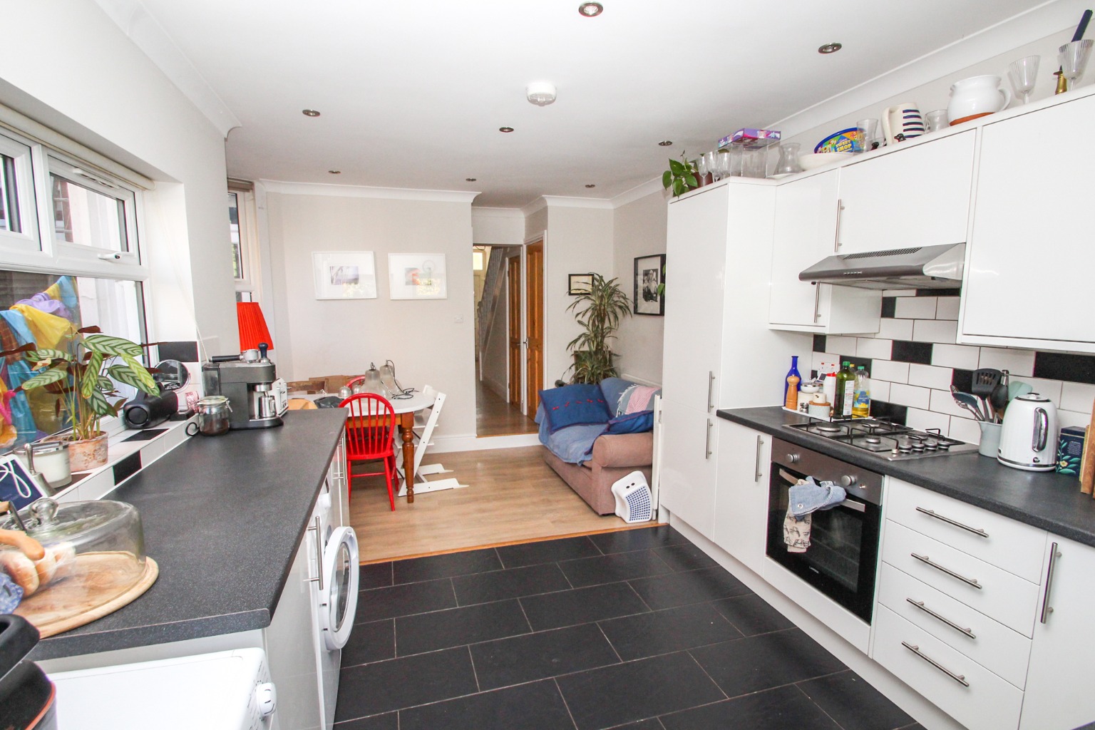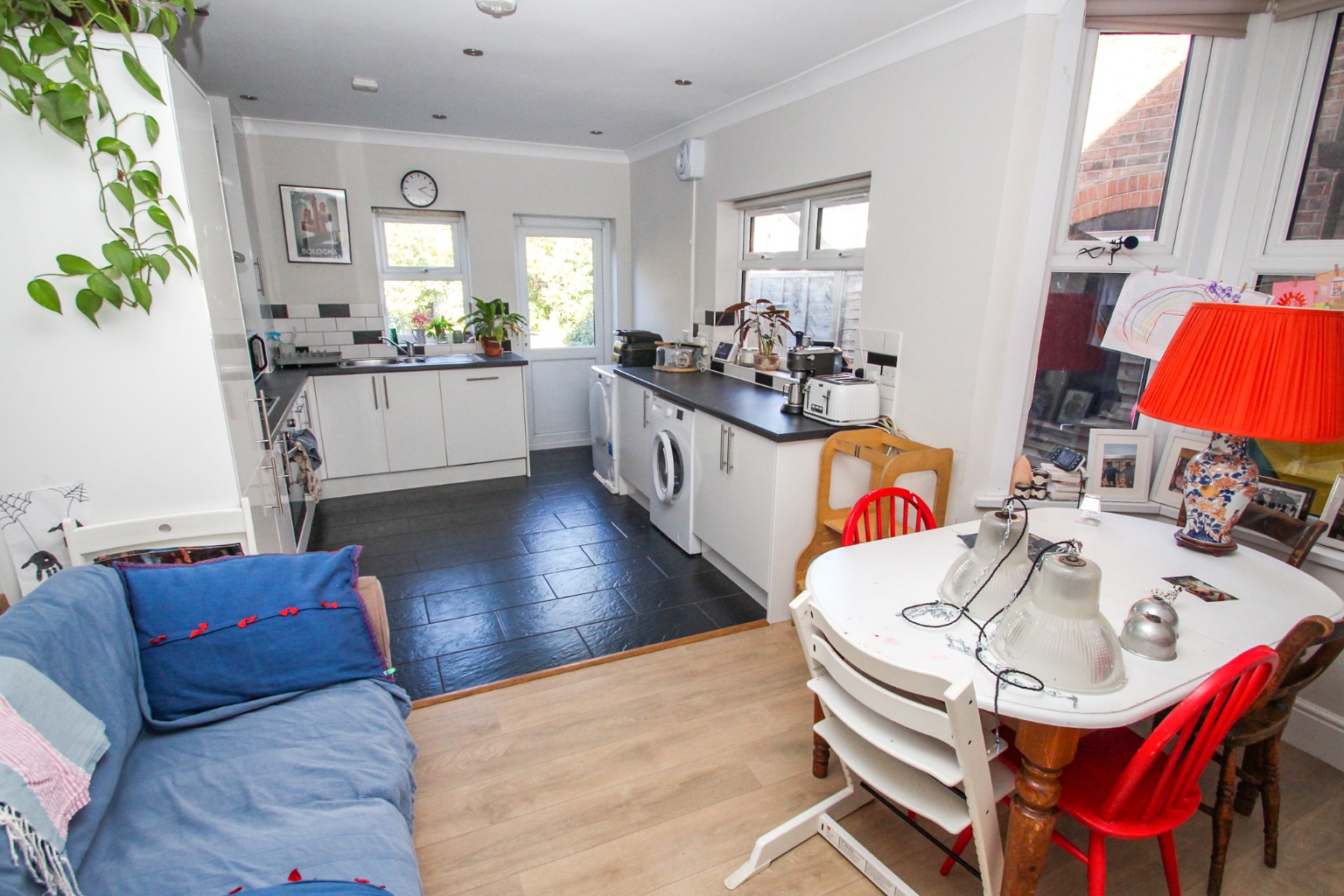 Completing the ground floor accommodation, we have the kitchen/diner, with laminate flooring to the front part where you can place a dining table and chairs in front of a double glazed bay window. The back section comes with a tiled floor, white units to the sides and rear, a gas hob, electric oven, extractor hood, washing machine and a fridge/freezer. A double glazed door gives you access to the garden, which we'll come to later (it's huge)