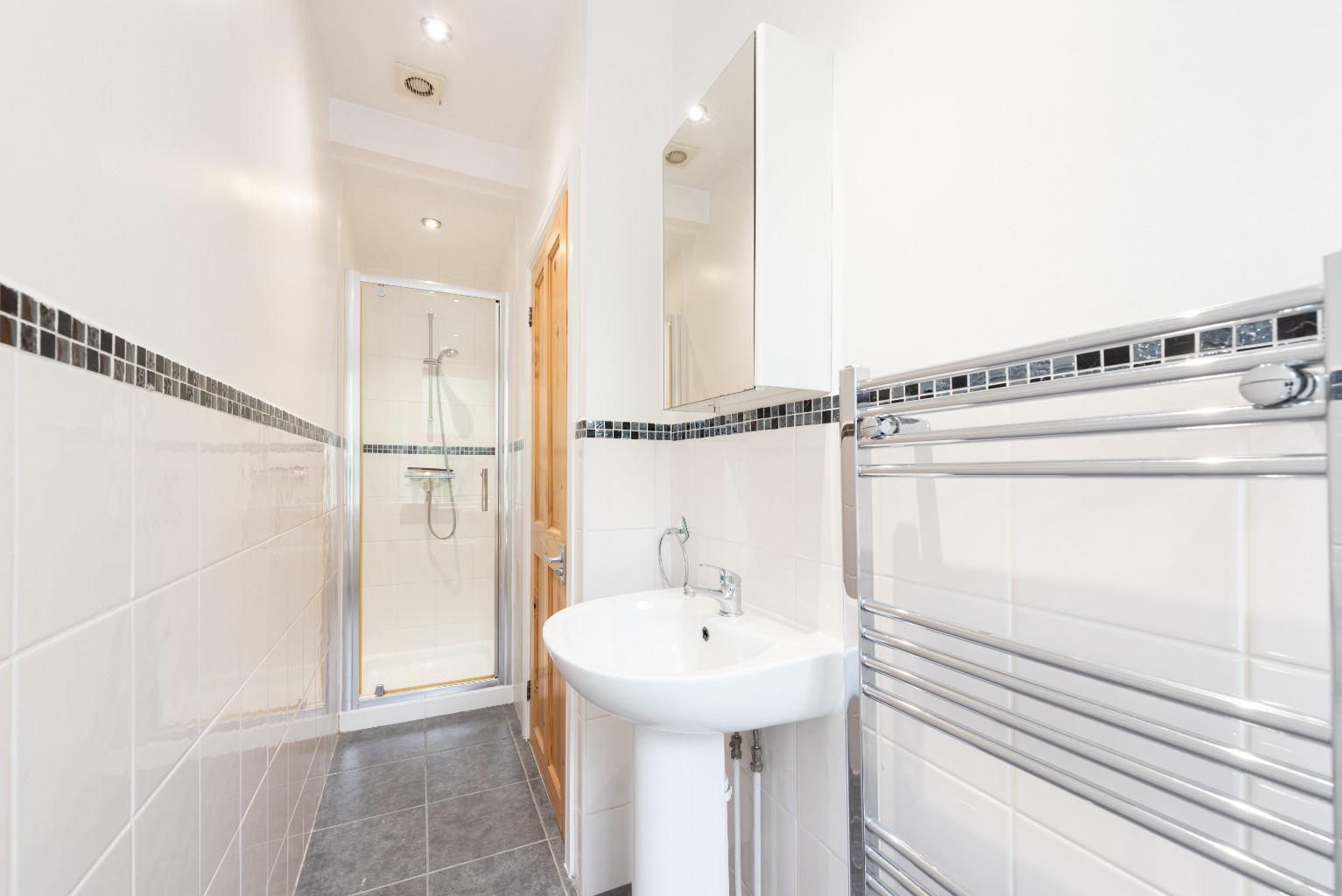 The shower room has a tiled floor, semi tiled walls, double glazed window, a bathroom cabinet, heated towel rail, shower cubicle, washbasin and a low-level toilet.