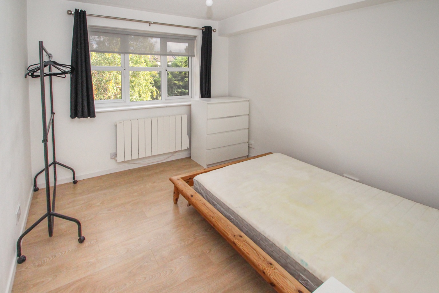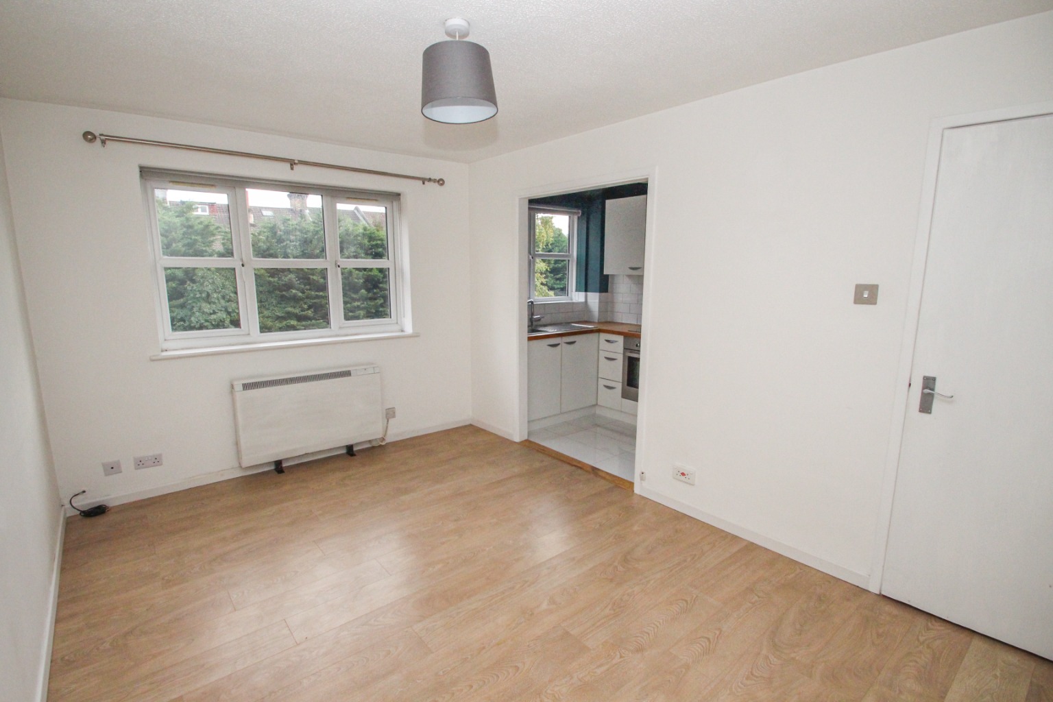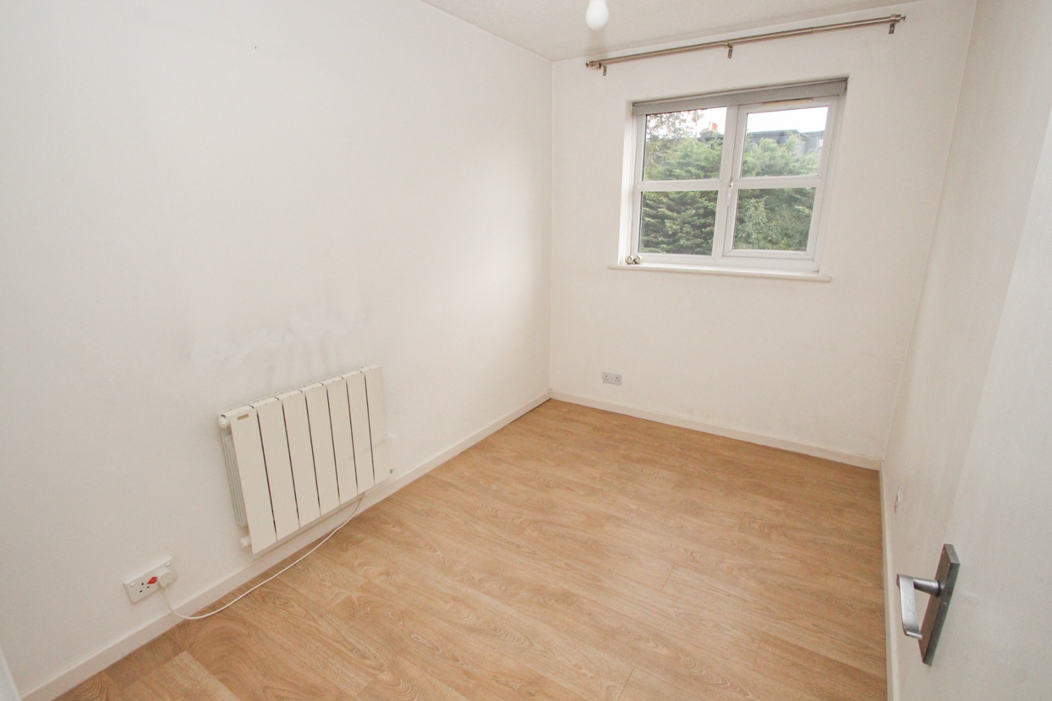 The bright living room has a double-glazed window looking out to the rear, away from the High Road, with white painted walls, high quality laminate flooring in a limed oak appearance, and two electric heaters.