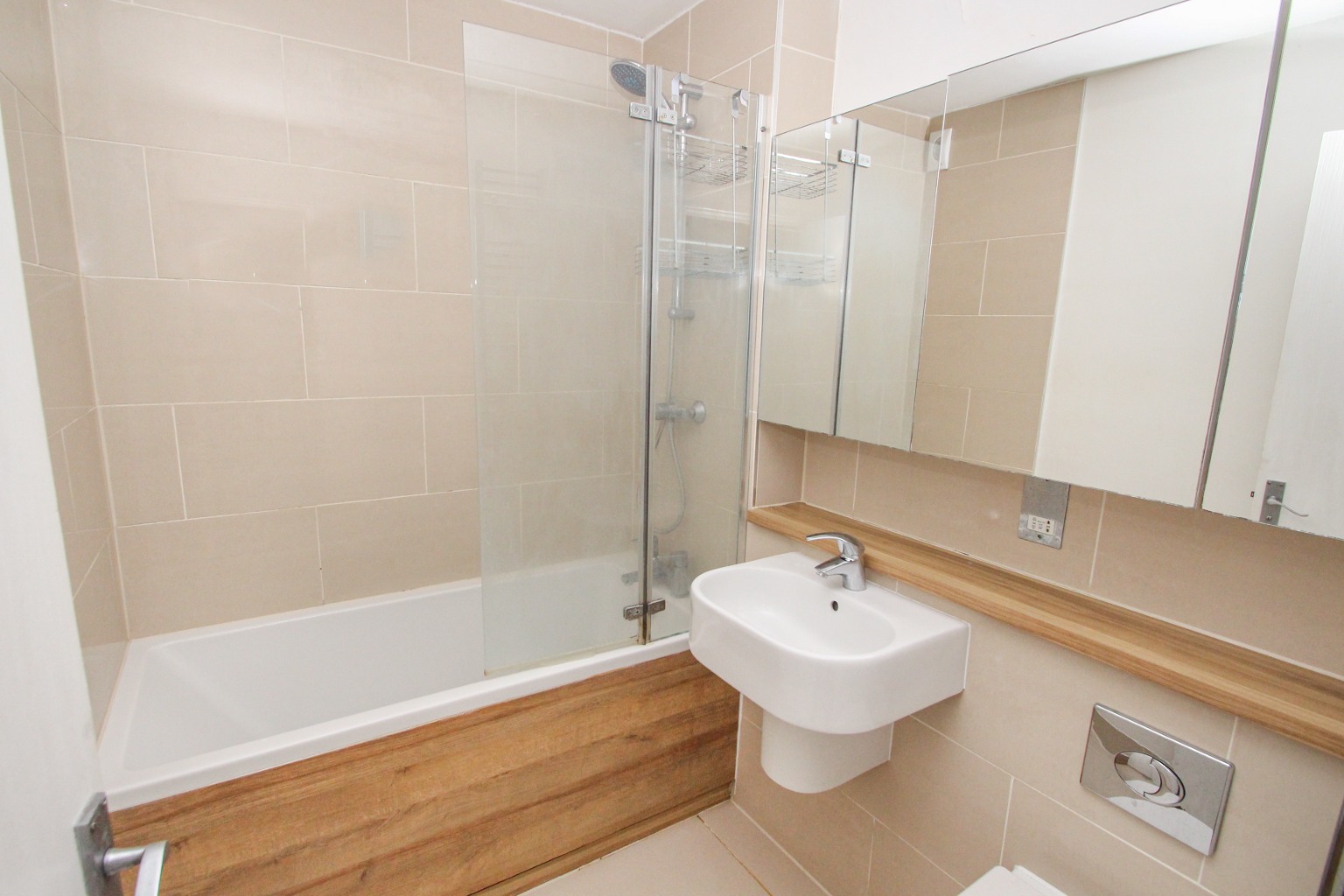 Moving onto the fully tiled bathroom, you’ll find a modern three-piece suite. The bath has a fitted shower and screen, and the pumped water supply ensures good water pressure. There is also a heated towel rail and a mirrored unit for all your toiletries.