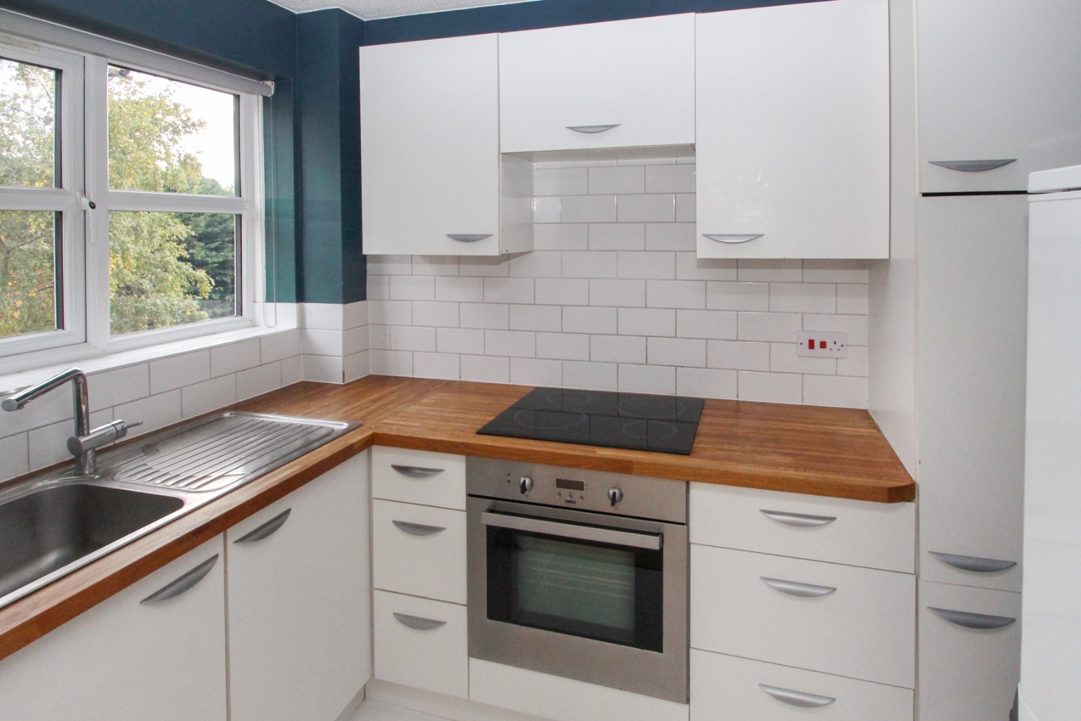 The kitchen has a double glazed window, tiled floor, white fitted wall and base units, wooden worktops and white brick-style splashback tiling. There is an electric oven and induction hob, fridge/freezer, and the property also has a washing machine (cupboard in the hall).
