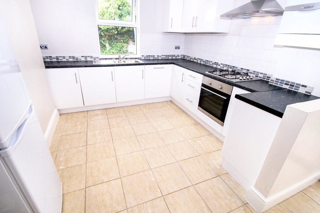 The kitchen has a tiled floor with fitted white wall and base units, contrasting black worktops, an integrated gas hob, electric oven, stainless steel extractor hood, washing machine and a fridge/freezer. There is a double glazed window that looks out to the garden.