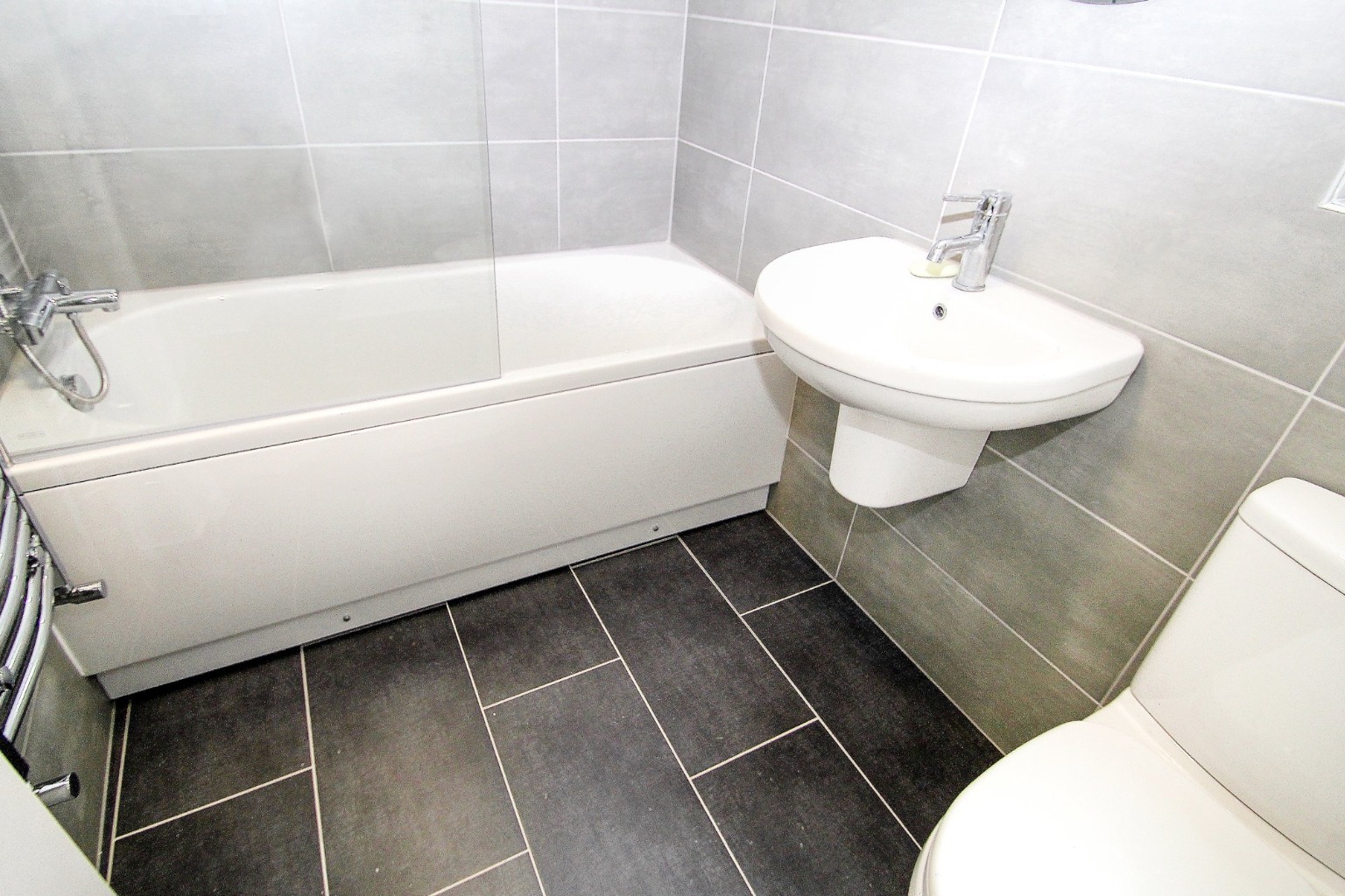 The bathroom has a tiled floor, tiled walls and a modern white three-piece suite.