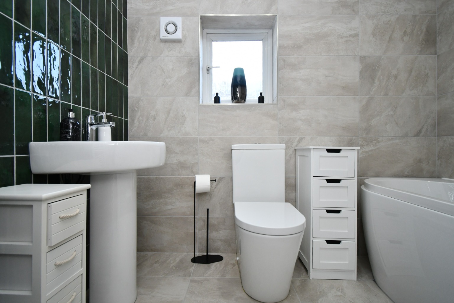 The property also features a modern three-piece bathroom suite. This includes a panelled bath with an overhead shower, a wash hand basin, and a low-level WC, all finished to a high standard. The bathroom provides a clean and functional space for daily routines.