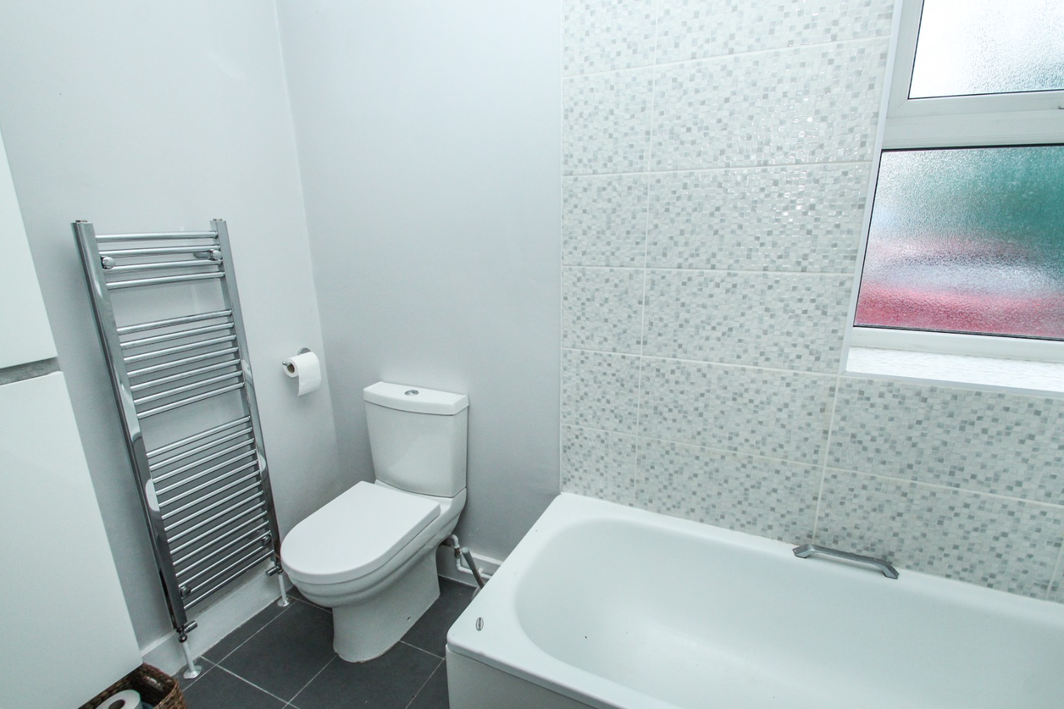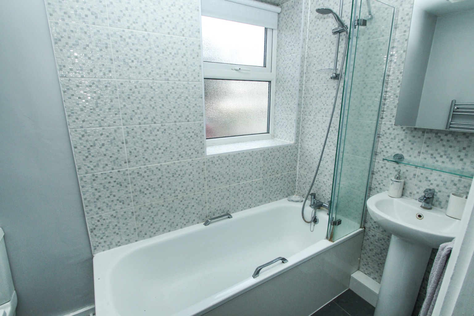 The bathroom is tiled and includes a three-piece suite with a folding shower door to the bath, plus there's a heated towel rail and a mirrored medicine cabinet.