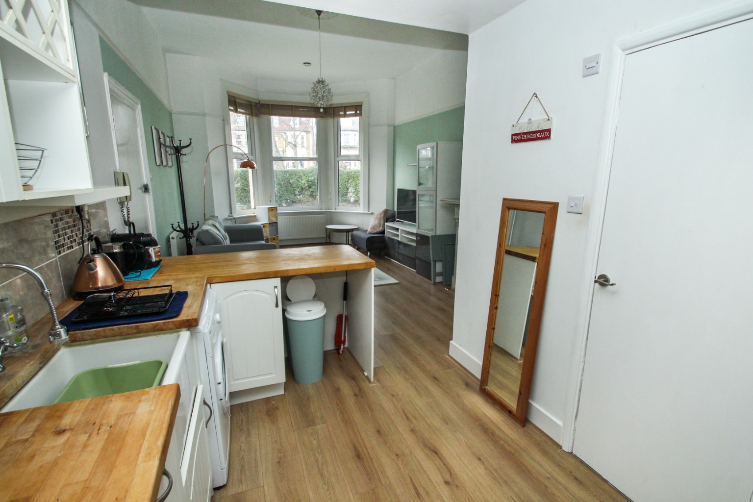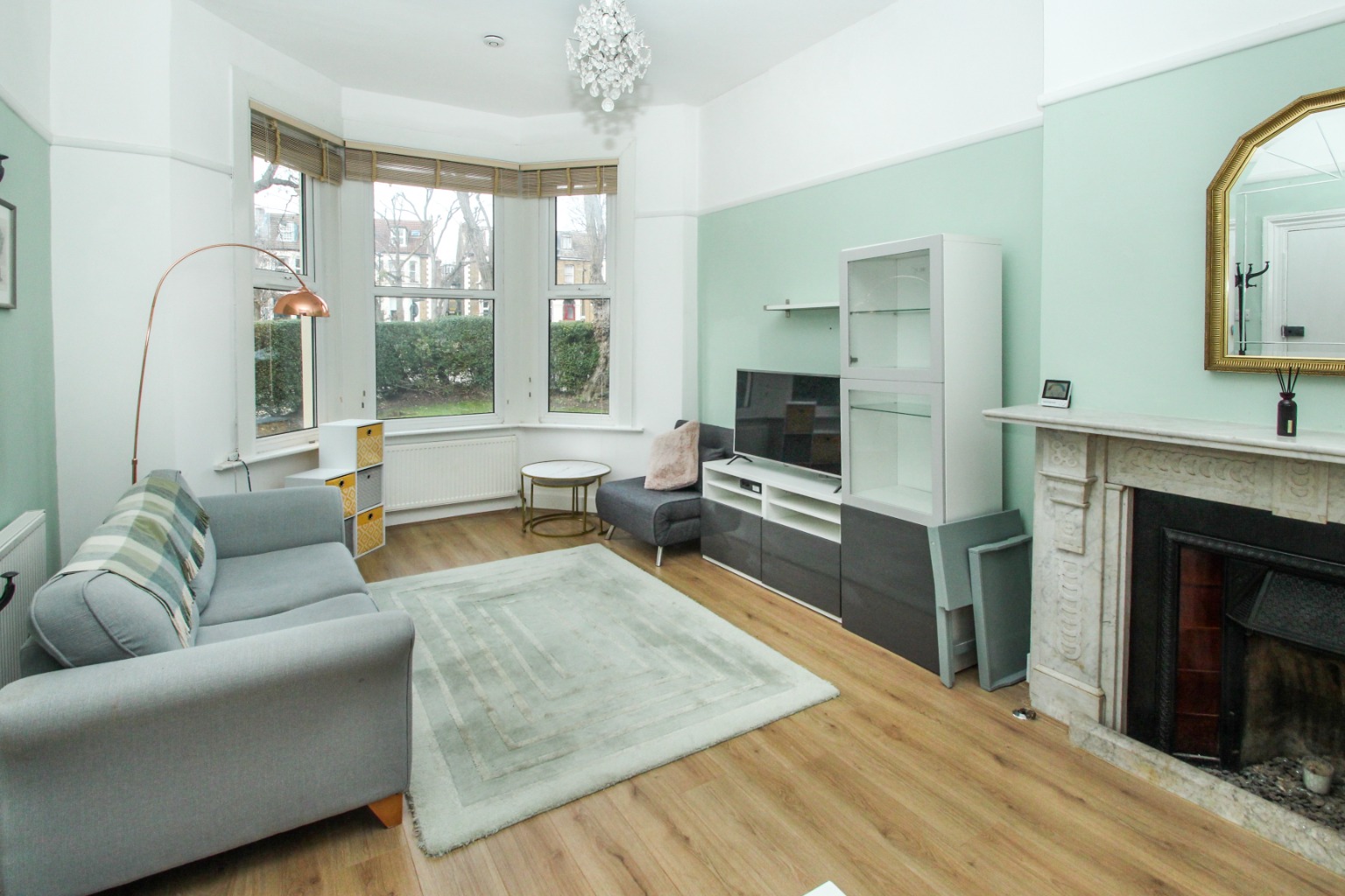 Once inside the flat, you enter the living room with a double glazed bay window to the front and a decorative feature fireplace. There's easy-to-clean laminate flooring, and the landlord is providing a sofa, a low-level white storage unit, a rug and a looping lamp.