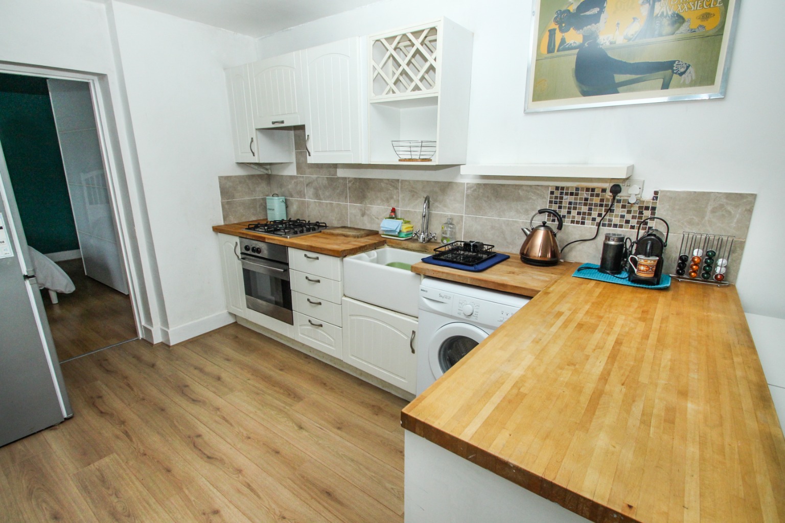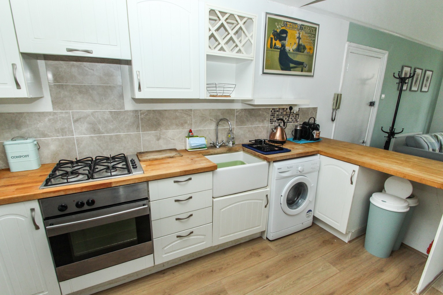 Just behind the living room, in an open plan layout, you'll come to the kitchen, with wooden work-tops, a Butler sink, ample storage cupboards, plus the usual white goods – washing machine, oven and hob, fridge/freezer.