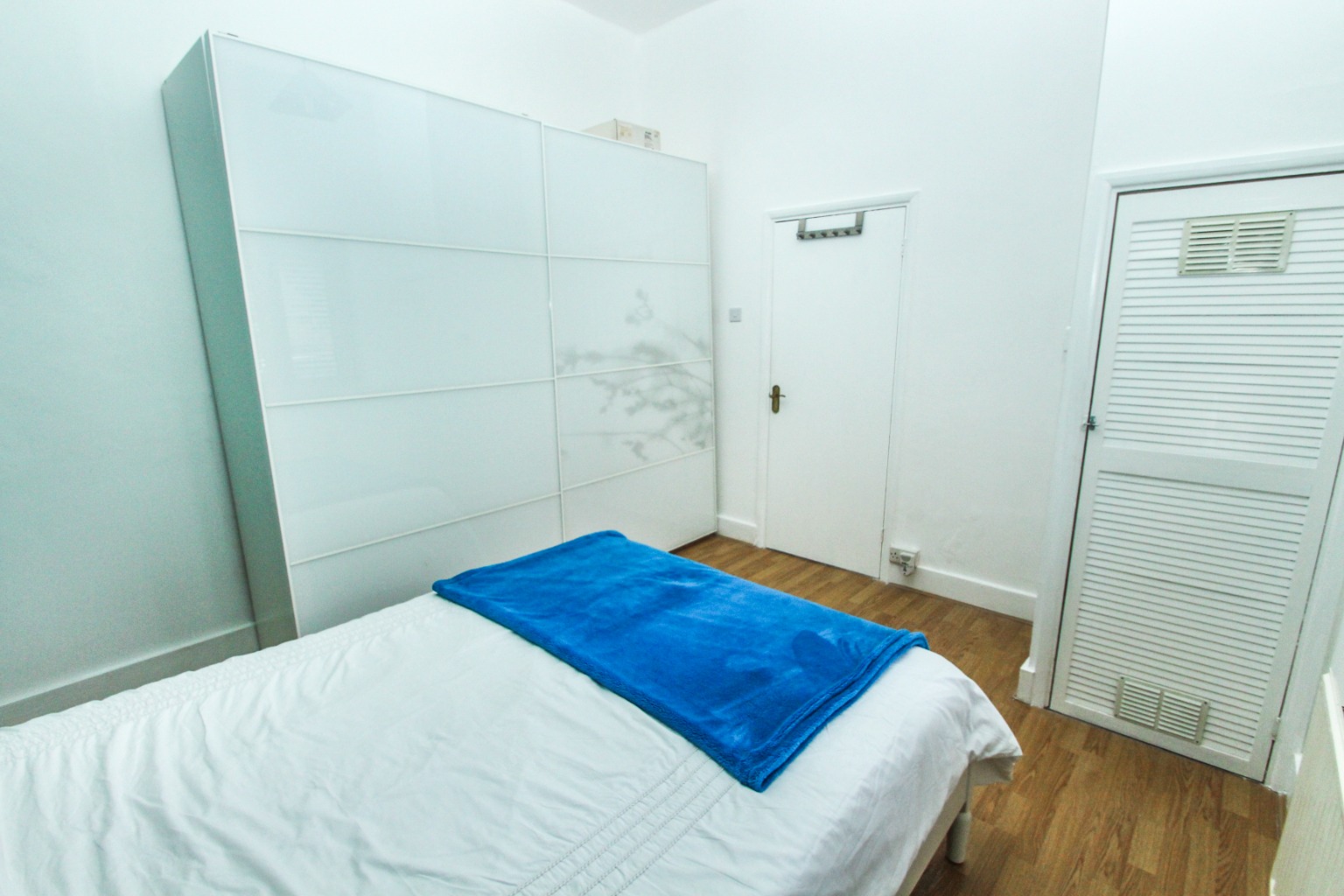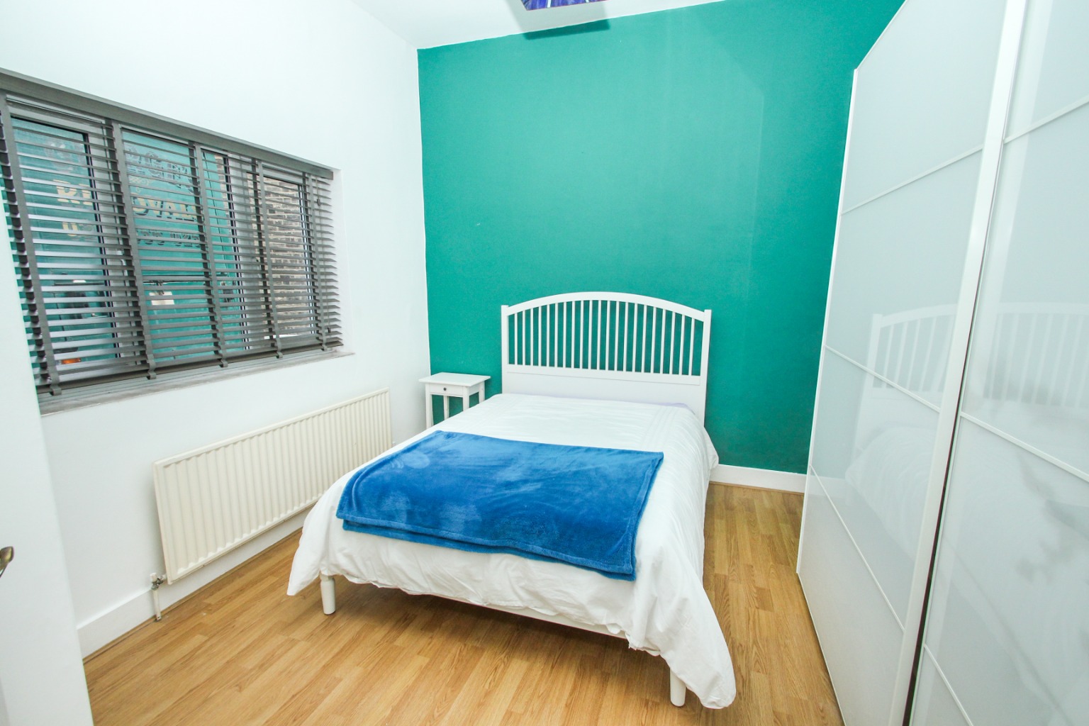At the rear of the home lies the double-sized bedroom, with laminate flooring and contrasting decorative walls. The landlord is providing a double bed (base) and a spacious double wardrobe with sliding doors.