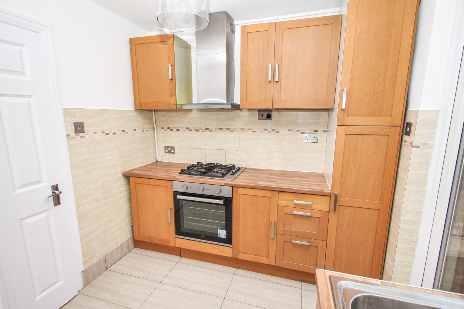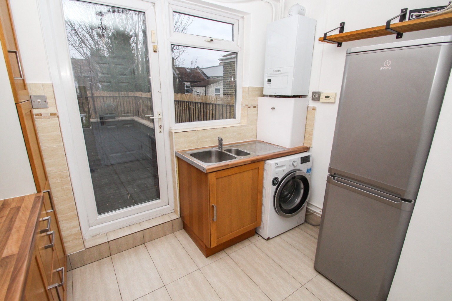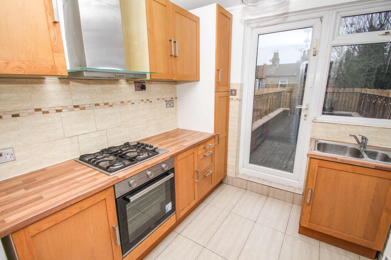 The kitchen has wood effect wall and base units, worktops and contracting splashback tiles. There's a double glazed door opening out onto the roof terrace and a double glazed window positioned in front of the sink area. The kitchen appliances include a stainless steel gas hob, electric oven and matching extractor, fridge/freezer and washing machine. A new boiler has also just been installed.Upstairs, with bedroom one located at the front fitted with new carpet and painted white walls featuring a fitted wardrobe and a space-saving drawer system for all your clothes, shoes, bed lining and accessories. To each side of the drawers, you'll find a deep cupboard, with bundles of space for your lesser-used items such as suitcases and decorations. There is also a radiator and full width double glazed window.