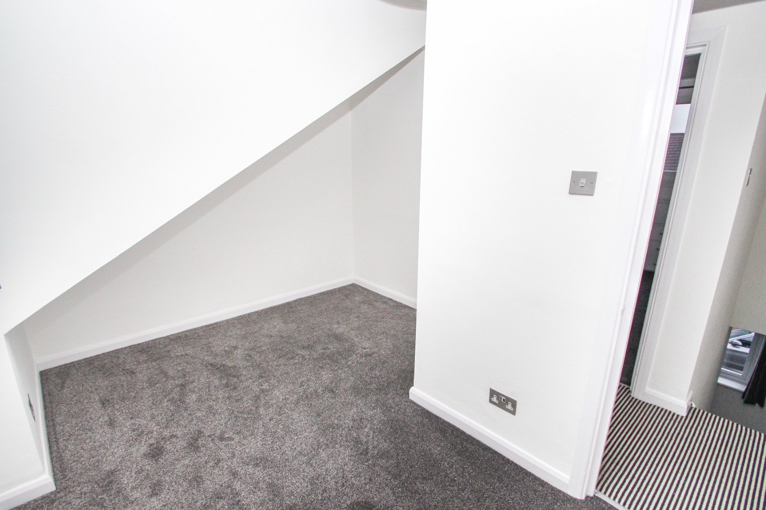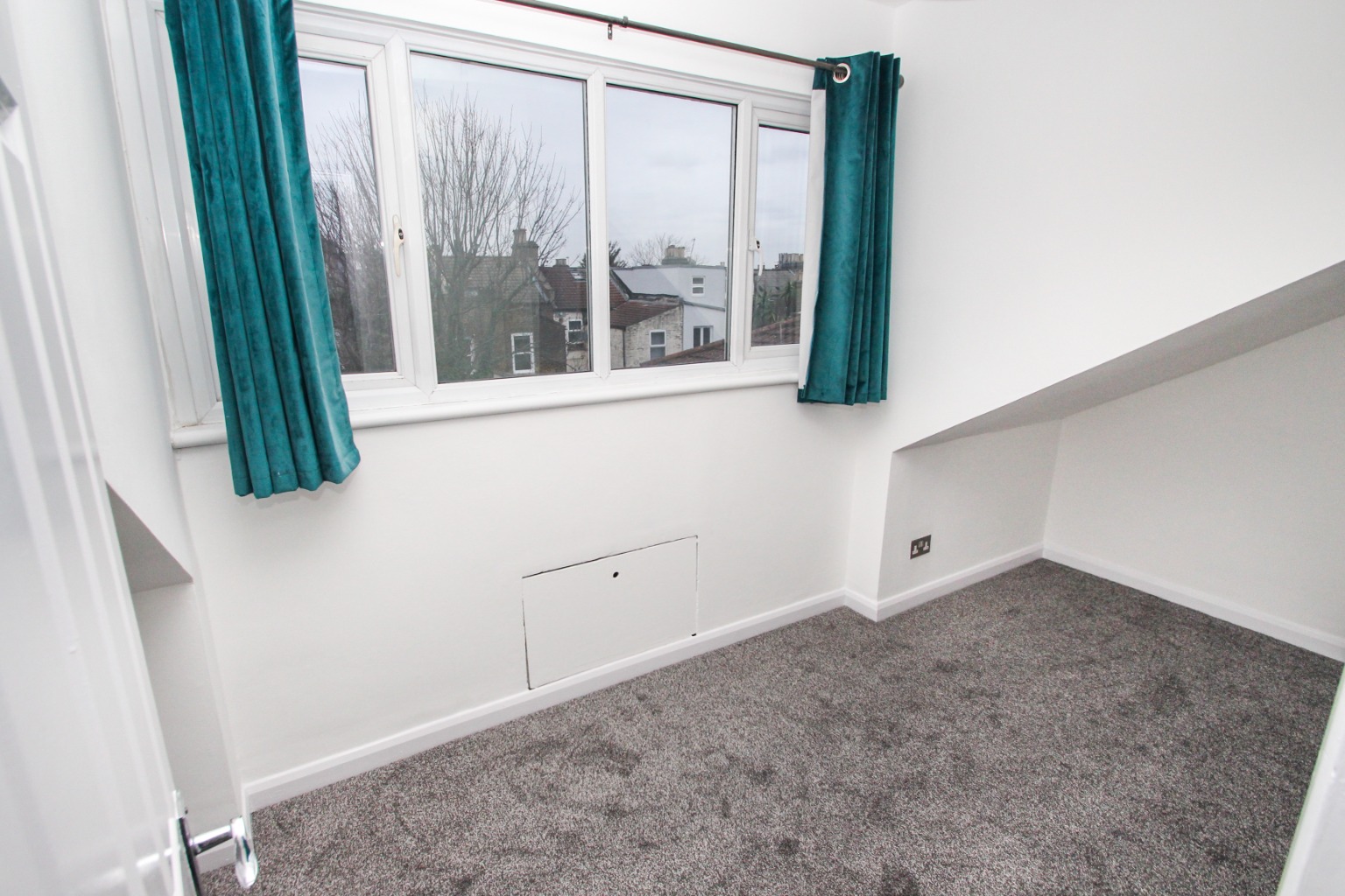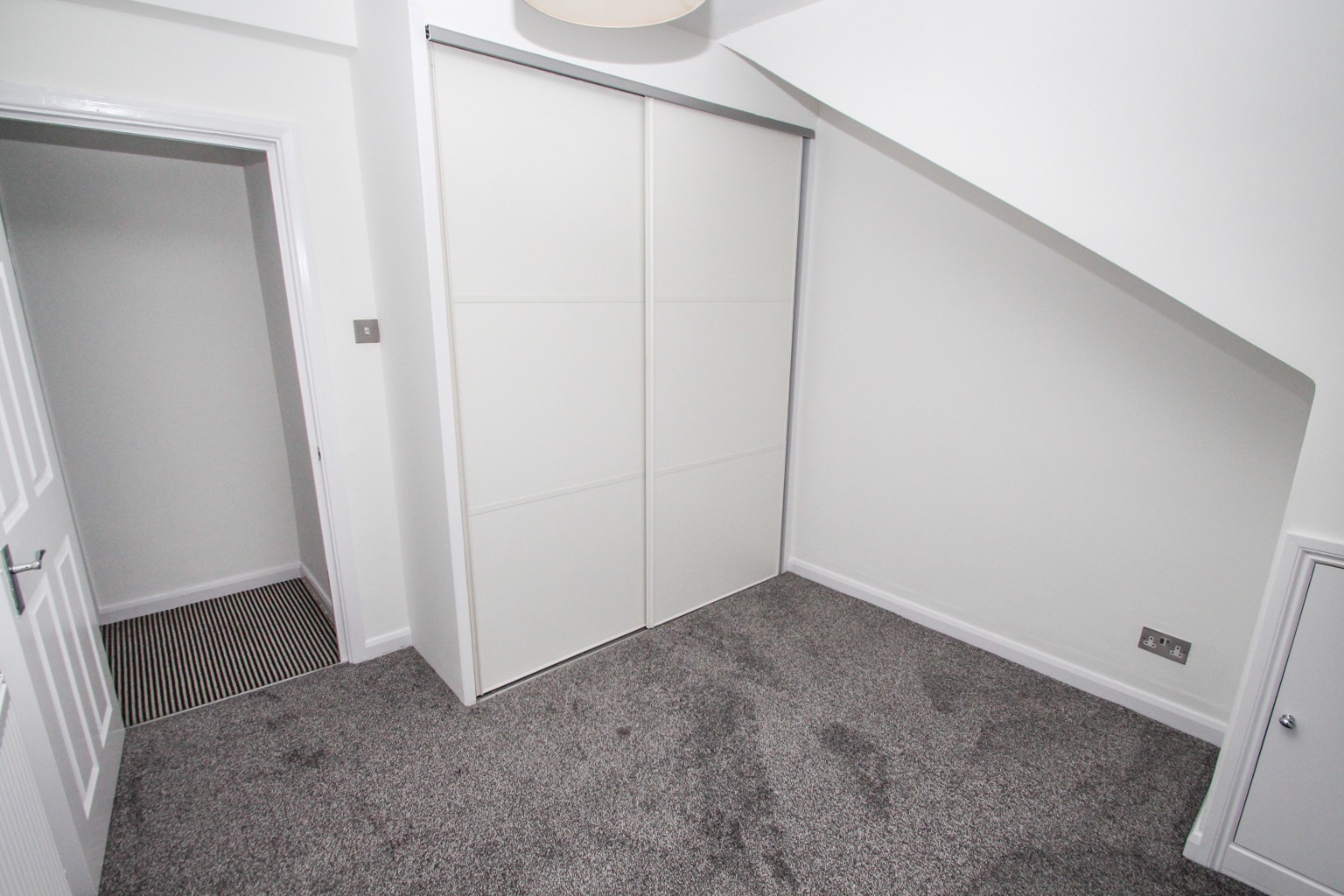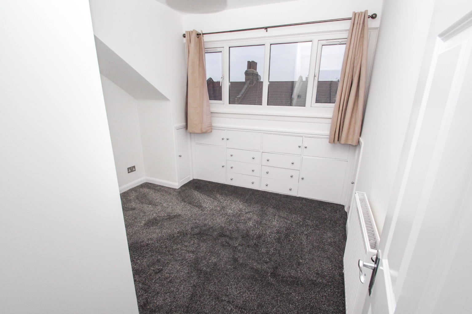 Bedroom two is also fitted with new carpet and painted white walls, with space for a double bed and wardrobe. There is also a radiator and a double glazed window, along with another storage cupboard.